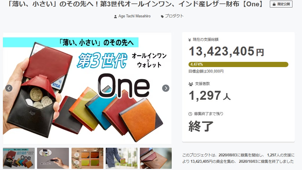 2020年8月 第3世代オールインワンウォレット『One』machi-yaリリース 支援総額:15,565,639円(延長PJ;2,142,234円を含む)