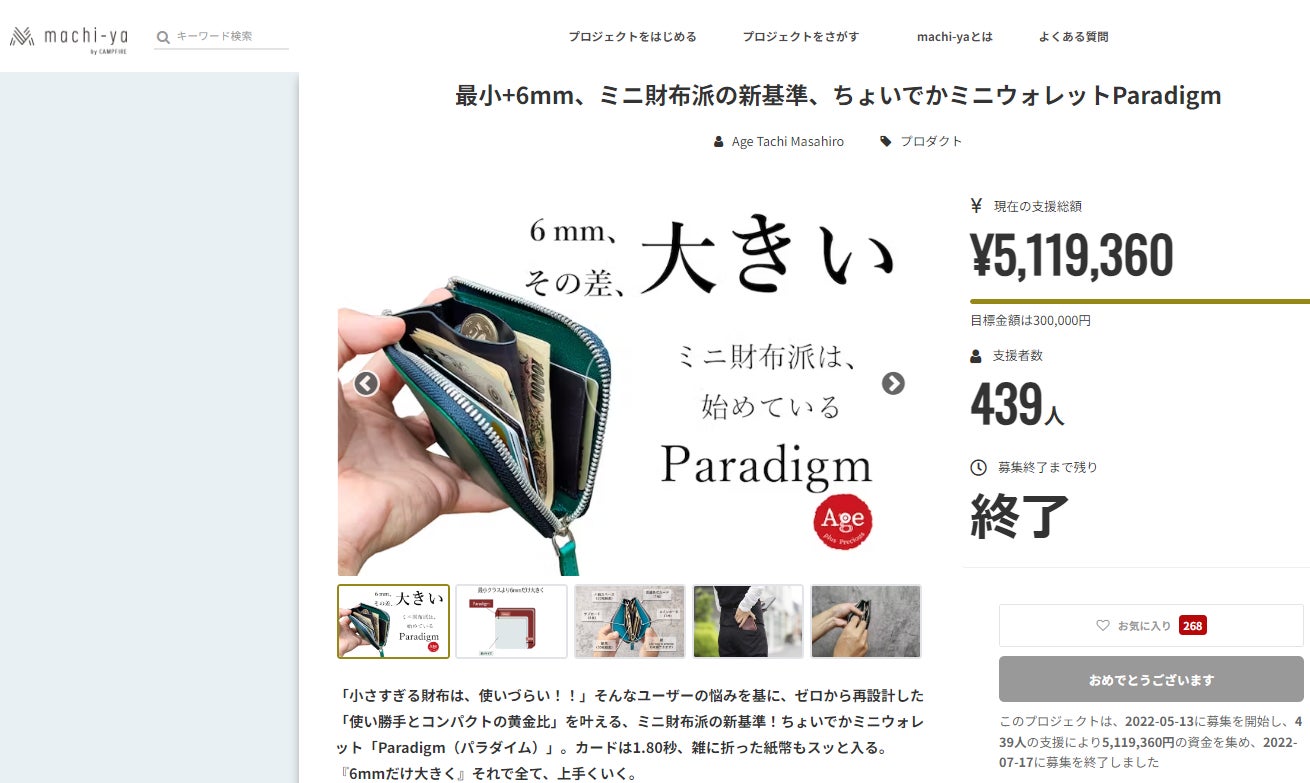 2022年7月 最小+6mm、ミニ財布派の新基準、ちょいでかミニウォレットParadigm machi-yaリリース 支援総額:5,119,360円