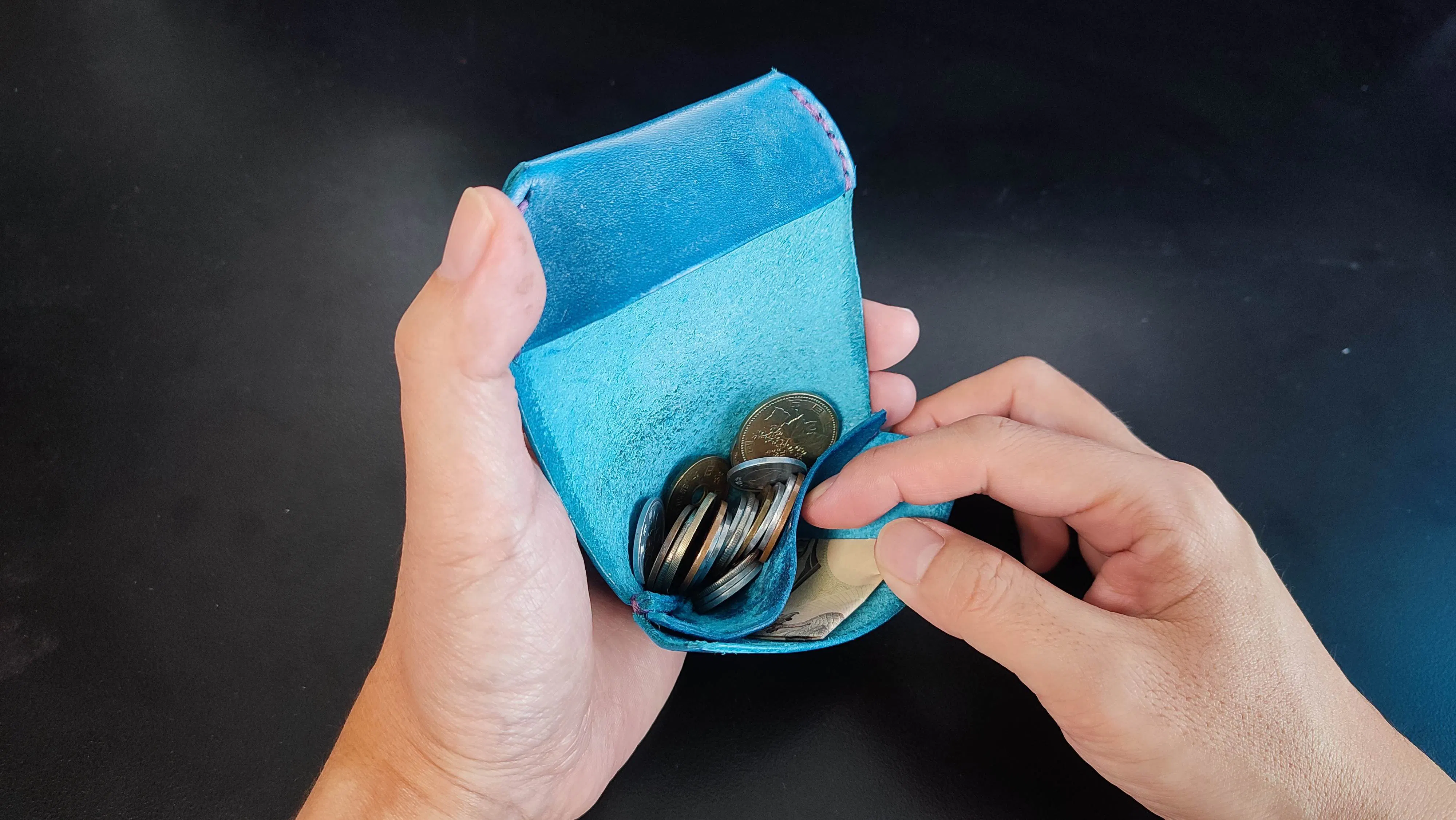 硬貨30枚、お札4枚程ぐらいがMAXの収納量です(動画は硬貨24枚、お札1枚)。