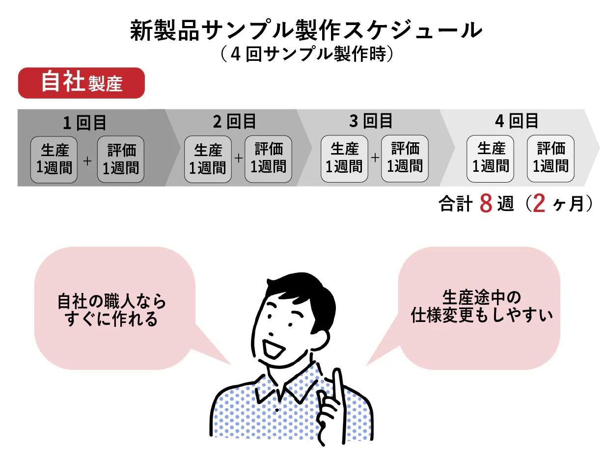 自社(弊社職人)が生産することで、サンプル~製品化まで1/4(8ヶ月⇒2ヶ月)の期間に