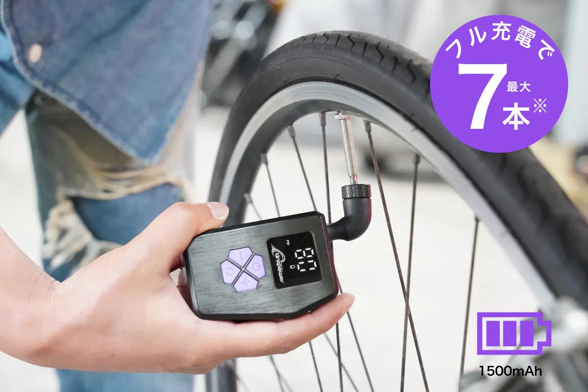 フル充電でロードバイク(700×23C・80PSI)のタイヤ最大約7本分に空気を充填可能!