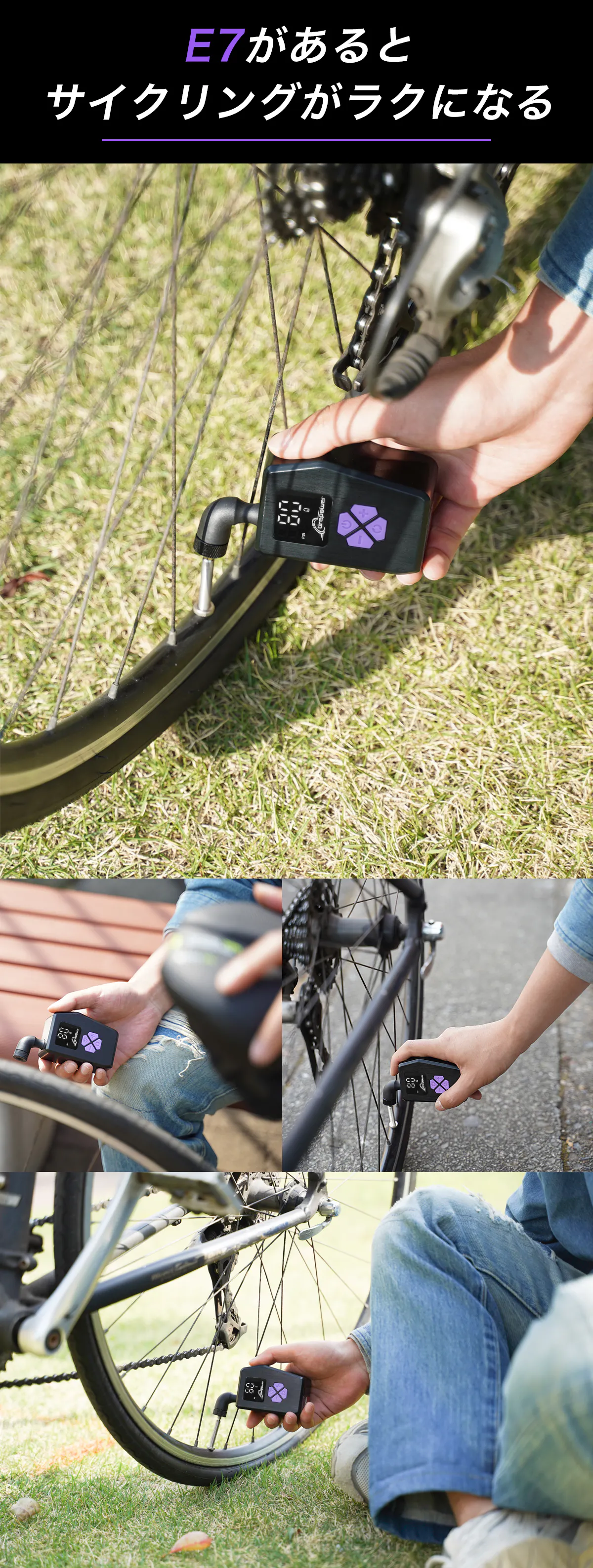 Tirepower E7は、自転車タイヤ、バイク、ボールに対応する超小型空気入れです。軽量コンパクトな設計で、ポケットやバッグにもすっきり収まり、携帯性に優れています。加圧状態での再始動やタイヤ圧の微調整機能を搭載し、ディスプレイ表示や自動停止機能なども充実。さらに、英式・米式・仏式バルブに対応しており、幅広いシーンで活躍します。作業効率を高め、サイクリングシーンをより快適にサポートします