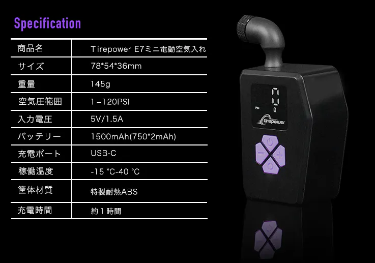 「Tirepower E7」は、サイクリング中のトラブルを強力にサポートする高エネルギー密度1500mAhバッテリーを搭載。