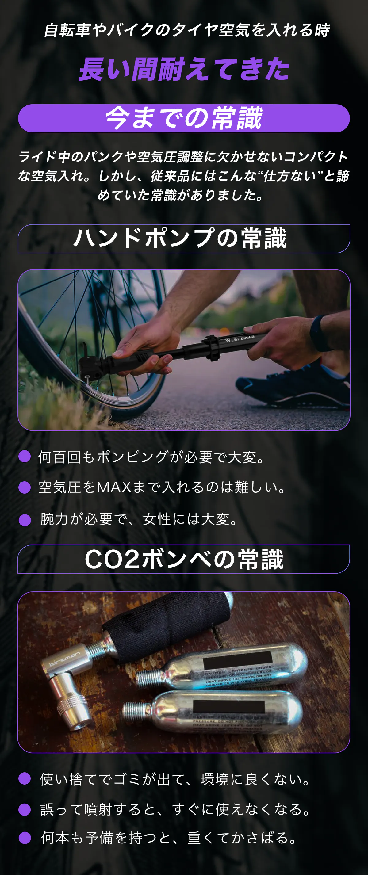 私たちは、日常の中で「空気入れが大きくて持ち運びに不便」「いざという時に空気入れが見つからない」「小型のものはパワーが足りない」といった悩みを何度も経験してきました。出先で空気圧が足りないタイヤや、アウトドアシーンでのちょっとした空気補充の必要性など、誰もが一度は感じたことのある「困った」を解決するため、Tirepowerは誕生しました。