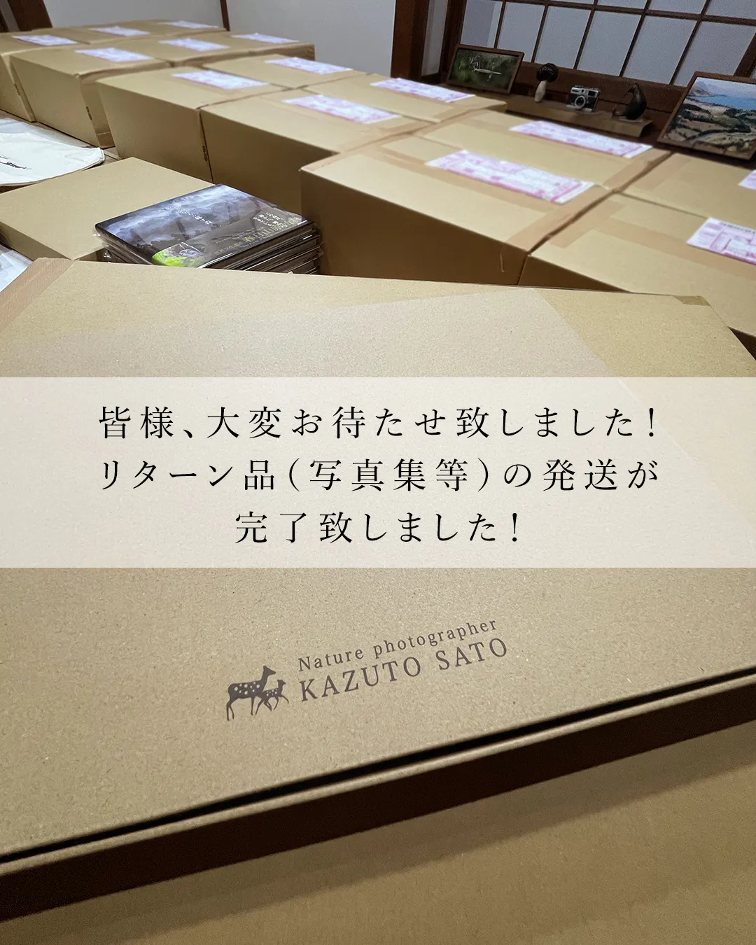 2025/11/03 13:06皆様、大変お待たせ致しました!スタッフ皆んなで力を合わせて、心を込めて、全てのリターン品の発送が本日完了いたしました!近日中にお届けできるかと思います。ポストカード、写真集のみ、トートバックセットを選んでいただきました皆様には、クイックポストにて郵送させていただきましたので、ご自宅のポストに投函されます。写真集5点セット、写真集+作品フレームをお選びいただきました皆様には、クロネコヤマト便にて発送いたしましたので、玄関等でお受け取りの方よろしくお願い致します。本当にこの度は皆様に応援いただき、凄く良い写真集に仕上がりました!ぜひお手元に届きましたら、ごゆっくりご覧頂けますと幸いです。また、現在キヤノンギャラリー銀座で開催中の写真展はご好評いただき無事前半(10/28 - 11/1)を終えました!先日11月1日(土)に開催したギャラリートークでは、予想を超える40名もの方々にお越しいただきました!また、特別ゲストお二人にも無理を言って急遽お話いただき、おかげさまで貴重で楽しい特別な時間となりました。ギャラリートーク後は奈良の事務所へと戻り、スタッフ総出で発送作業を行い、発売前には無事皆様にお届け出来るかなと、ホッとした気持ちでおります。また明日朝一から東京へと向かい、後半の展示も(11/4 - 11/8)全日在廊しておりますので、ぜひ関東方面の皆様、お会い出来るのを楽しみにしております!2回目のギャラリートークは、最終日の11月8日(土)15:00〜、展示会場にて開催致します。申込不要・観覧無料となっておりますので、お気軽にお越し頂けると嬉しいです!※最終日11月8日(土)、10:30〜13:00、17:00〜18:30の間、佐藤和斗はギャラリー隣のフォトハウスにて別イベントのため、不在となります。(代わりにスタッフ2名が在廊しております。)イベントの詳細はまだお伝えできませんが、ご都合の良い方はフォトハウスでも佐藤和斗がお話させていただきますので、ぜひお越しくださいませ。皆様、引き続きどうぞよろしくお願い致します。2025.11.3 佐藤和斗 もっと見る