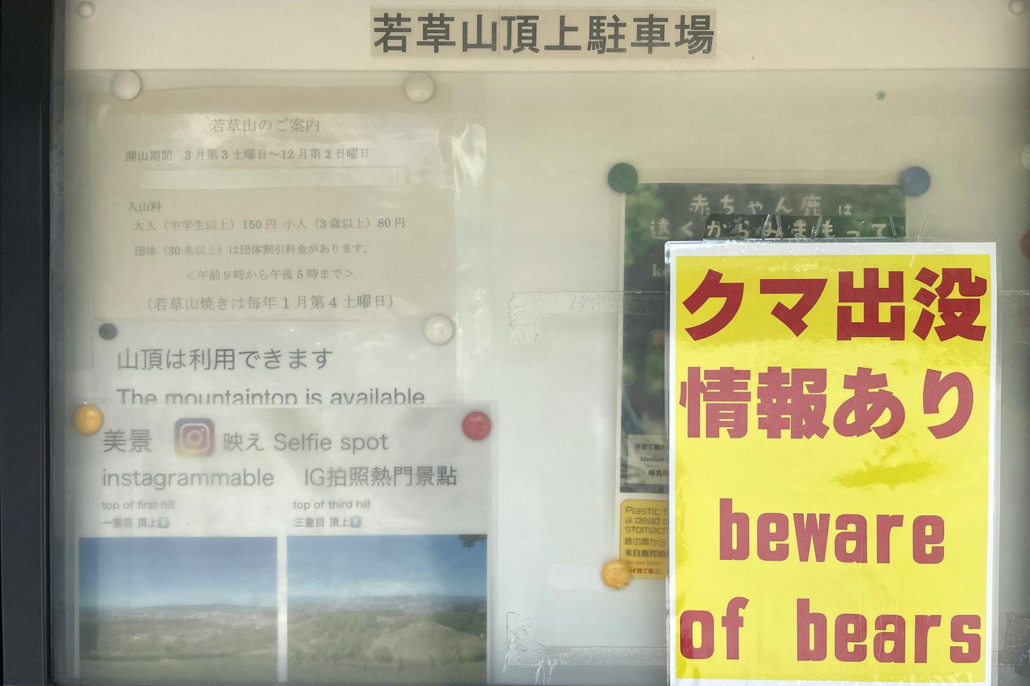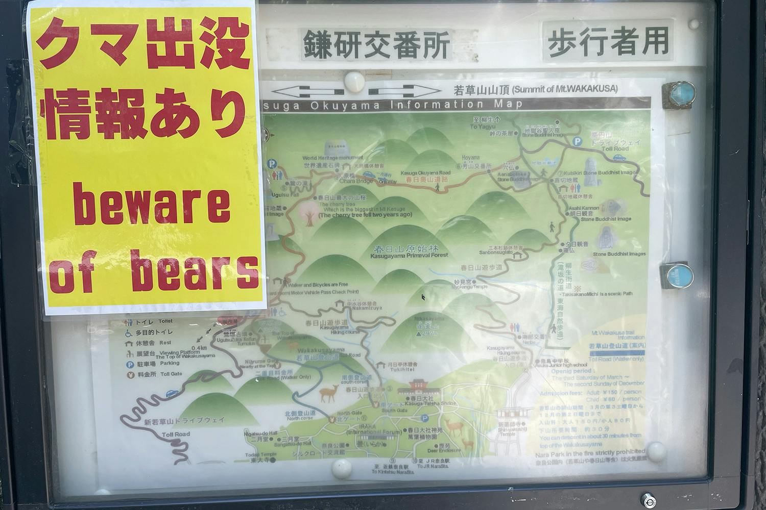 ただ、若草山駐車場付近では、クマ目撃ありの注意喚起の紙も貼られており、昨日の夕方(7月9日pm17:40頃)若草山の駐車場近辺でツキノワグマが林の中を横切っていく姿を僕も実際に見かけました。
