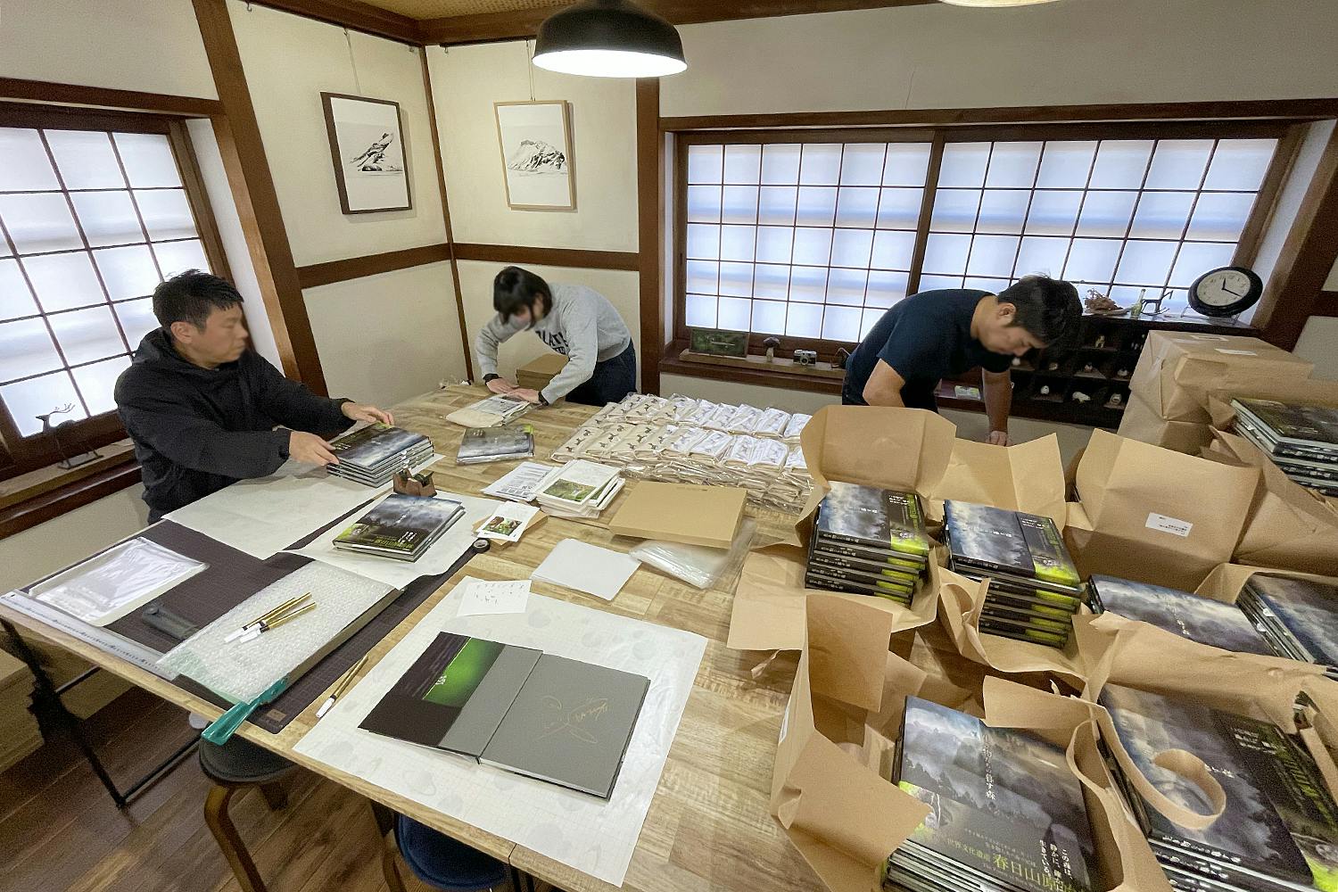 先日、完成した写真集が届き、早速スタッフ総出で皆様にお届けさせていただくリターン品の梱包作業を行いました!