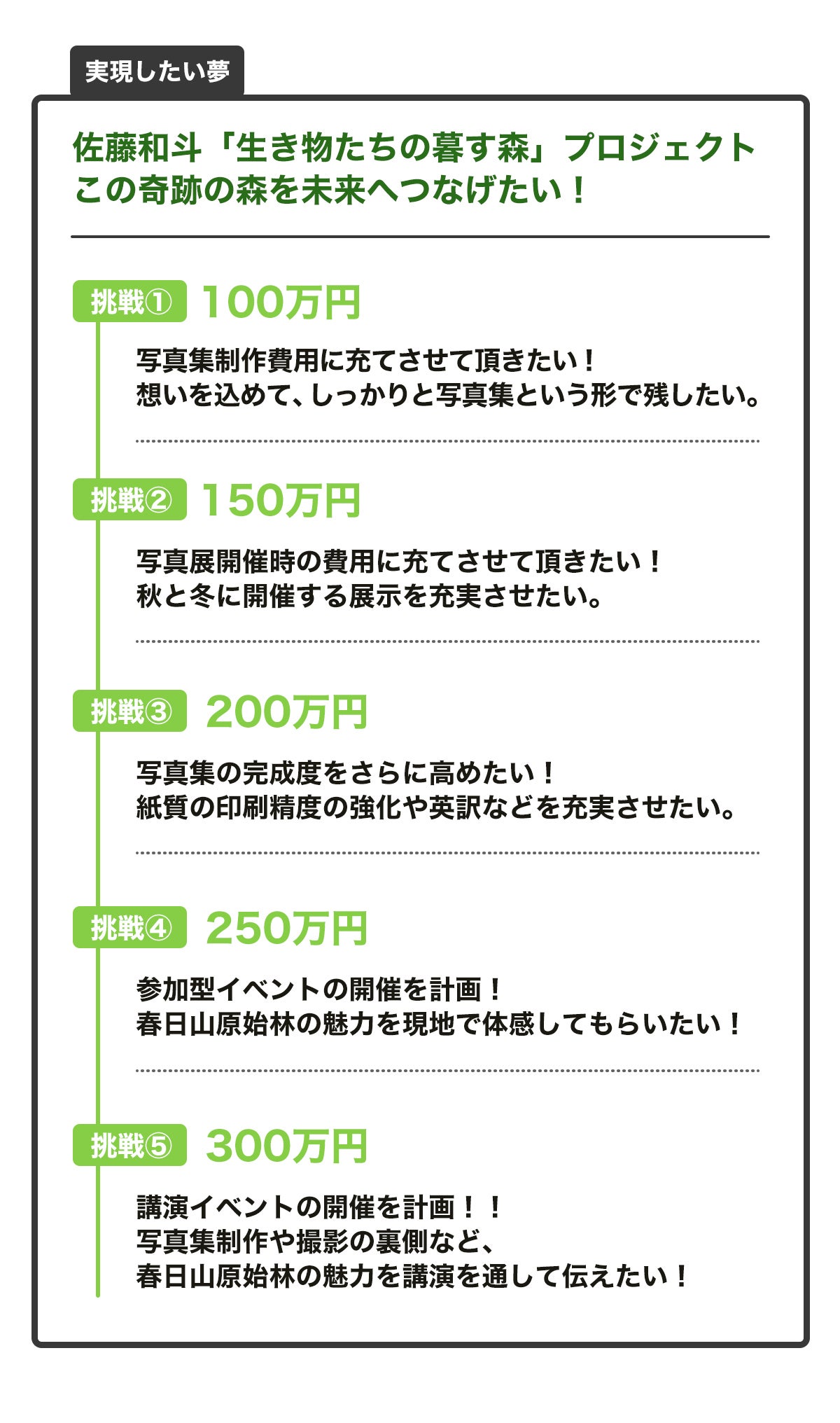 達成できた際には、写真集の完成度をさらに高め、今秋開催予定の写真展でも展示内容を一層充実させ、より多くの方にこの森の魅力を感じていただける場にしたいと考えています。