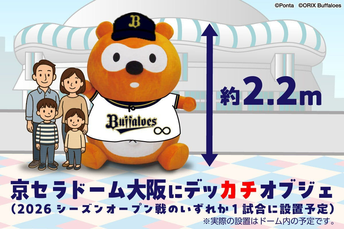 2026/03/03 10:59みなさま、大変お待たせいたしました!ついに・・・。バファローズ☆ポンタ巨大オブジェが完成しました!いよいよ3/22(日)バファローズ☆ポンタDAY にて設置いたします!■設置場所:京セラドーム大阪 3Fコンコース 13ゲート付近※7回裏終了時をもって撤去予定となりますので、ご観覧はお早めにお願いいたします。【お詫び】(本当に本当に申し訳ございません・・)1点、みなさまにお詫びがございます。想いを込めて“できるだけ大きく”制作した結果……大きく作りすぎてしまい、(高さ制限により)帽子を被せた状態での設置が困難であることが判明いたしました。楽しみにしてくださっていたみなさまには、心よりお詫び申し上げます。本当に申し訳ございません。急遽仕様を変更し、当日は「帽子を持たせる」形での設置とさせていただきます。それでも、実物を前にすると圧倒されるサイズ感です。ぜひ当日、その迫力を体感しにいらしてください。3/22(日)、京セラドーム大阪でお待ちしております。 もっと見る「交換権確定カード」をお持ちのみなさまへ