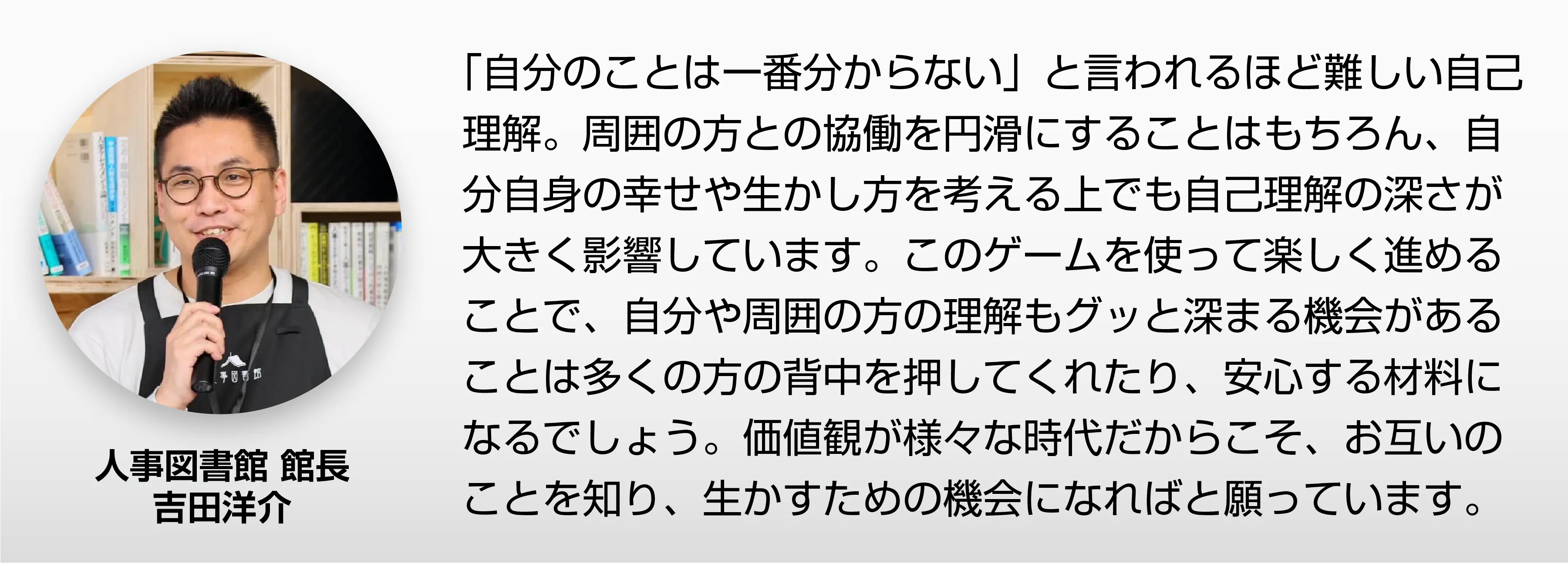 日頃あまり接点のない他部署のメンバー同士でも、価値観を起点に自然な会話が生まれそうで、「これなら距離が縮まりやすい」と感じました。仕事では見えにくい一人ひとりの想いや人柄を知るきっかけとして、インナーコミュニケーションの場でぜひ活用してみたいと思います。