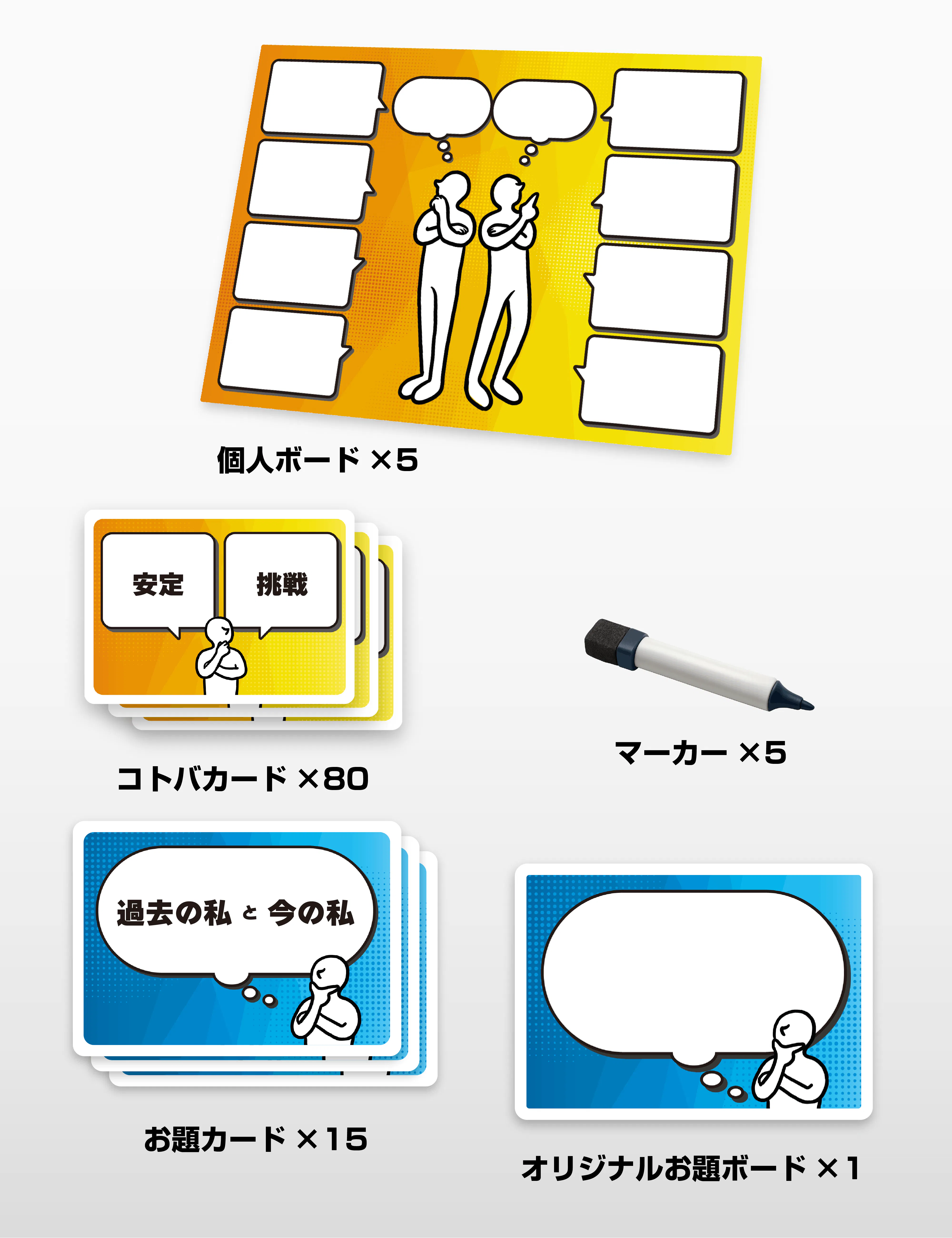 「過去の私と今の私」「仕事の私と私生活の私」など、異なる2つの対比したシチュエーションを表すカードを出題者が選び、各プレイヤーはそれをボードに記入します。次に出てくるカードからテーマに挙げた自分と合致するキーワードを選んで書いていくことになります。