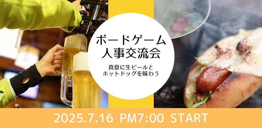 人事に関わる方々がボードゲームを通じて、仕事の悩みやヒントを共有しあえる仲間を見つけていただくための交流会。 今回はキンキンに冷えた生ビールを飲みながらおいしいホットドッグを頬張る、そんな真夏の夜にぴったりのイベントを開催します。夏の仕事を乗り切るために人事同士でおいしいお酒とご飯とゲームを楽しみませんか?同業界で一緒に頑張る人事仲間をこの交流会で見つけていきましょう!