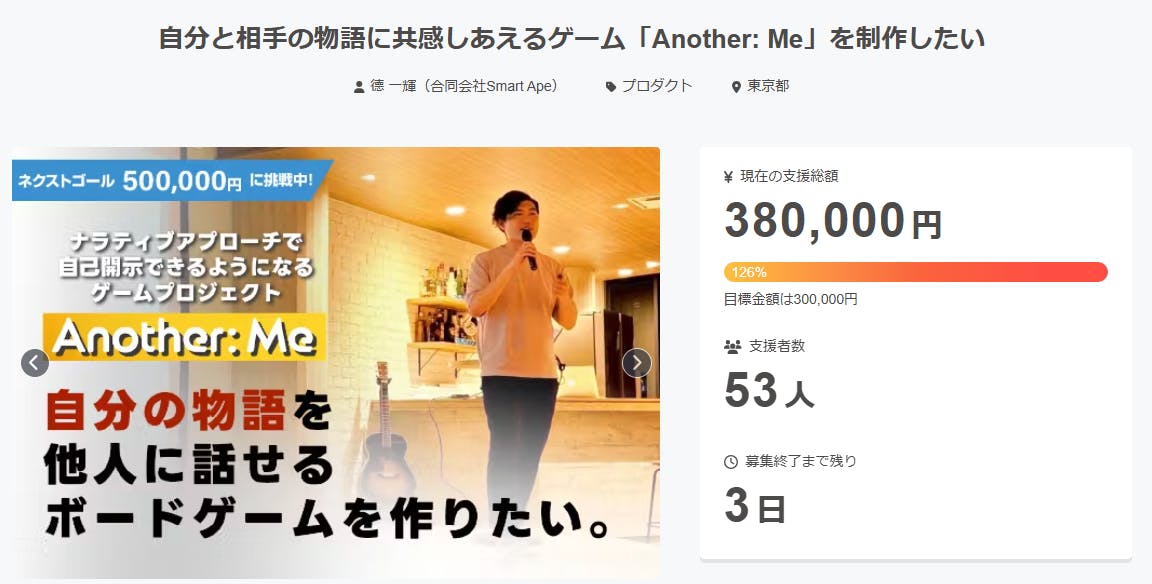Another:Meプロジェクト達成しました!!!物語を通して自己理解を育むビジネスゲーム「Another:Me」のクラウドファンディングですが、先週末7/25日時点で103%と無事達成することができました!!ここまでこれたのは、様々な形で応援いただいた皆様やプロジェクトに価値を感じてくださりご支援いただいた皆様のおかげです。本当にありがとうございます!!そして私たちは次のゴールを目指します。今までは30万円を目標としていましたが、ここから【50万】を目指します!!というのも、このビジネスゲームのイベントを多くさせていただく中で「このゲーム、もっと広がってほしいよね」という嬉しいお言葉をたくさんいただきました。なので、より多くの人の手に渡るように、ネクストゴールでより多くの資金を集め『Another:Me』の制作部数を増やす(300部→500部)ことを目指していきたいと思います。ネクストゴールを掲げてから2日間が経過し、現在もたくさんの方からご支援いただき達成率は126%までになりました。あと3日間ですが、残り12万円でネクストゴールも達成となります。みなさま、このプロジェクト最後の私のチャレンジをぜひ引き続き応援していただけると嬉しいです。どうぞよろしくお願いいたします!
