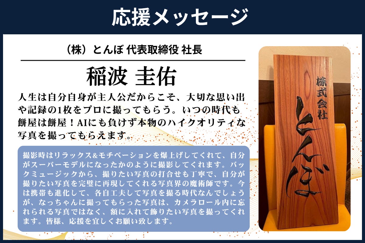 2026/03/16 18:16クラウドファンディングを応援、ご支援くださった皆さま。たくさんの応援とご支援を本当にありがとうございました。実は、クラウドファンディングページに「活動報告」という機能があることに気づいておらず、ご報告が遅くなってしまいました。本当に申し訳ありません。改めまして、皆さまからの温かいご支援に心から感謝いたします。2025年9月からリターンを開始し、約半年、終了となりました。今回のクラウドファンディングでは、想像を超えるほど多くの方に応援していただきました。SNSでシェアや投稿をしてくださった方々のおかげで、投稿を見た知り合いの方などこれまで直接お会いしたことのない方からもご支援をいただきました。そのご縁で、「こんな形でつながれるんだ」と胸がいっぱいになる出来事もたくさんありました。応援をしてくださいました皆様、リターンからスタジオにお越しいただいた皆様、心から感謝しております。そして、当初とても不安だったスタジオの更新も、無事に行うことができました。これもすべて、皆さまのおかげです。改めて、本当にありがとうございました。皆さまからいただいた応援を胸に、これからも「人の魅力が伝わる写真」を撮り続けていきたいと思っています。今後ともどうぞよろしくお願いいたします。 もっと見る