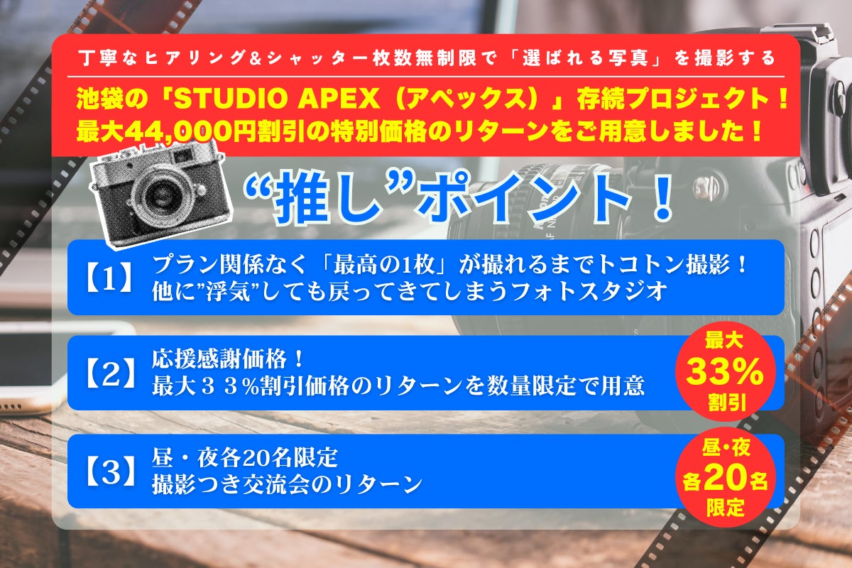 そして、日頃から応援してくださっている皆様への感謝の気持ちを込めて、特別な体験やお得なリターンをご用意させていただきました。クラウドファンディングという形で事前にご支援を募ることでより多くの方に想いを届け、STUDIO apexを知っていただきたいと考えています。