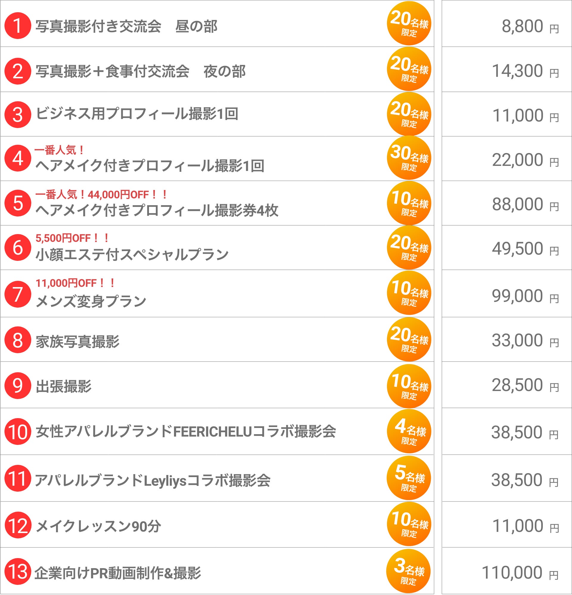 ・撮影セットプラン:トータルプロデュース撮影プラン/ハウススタジオ撮影プラン/バースデーフォトプラン/撮影+ヘアメイク+小顔エステセット
