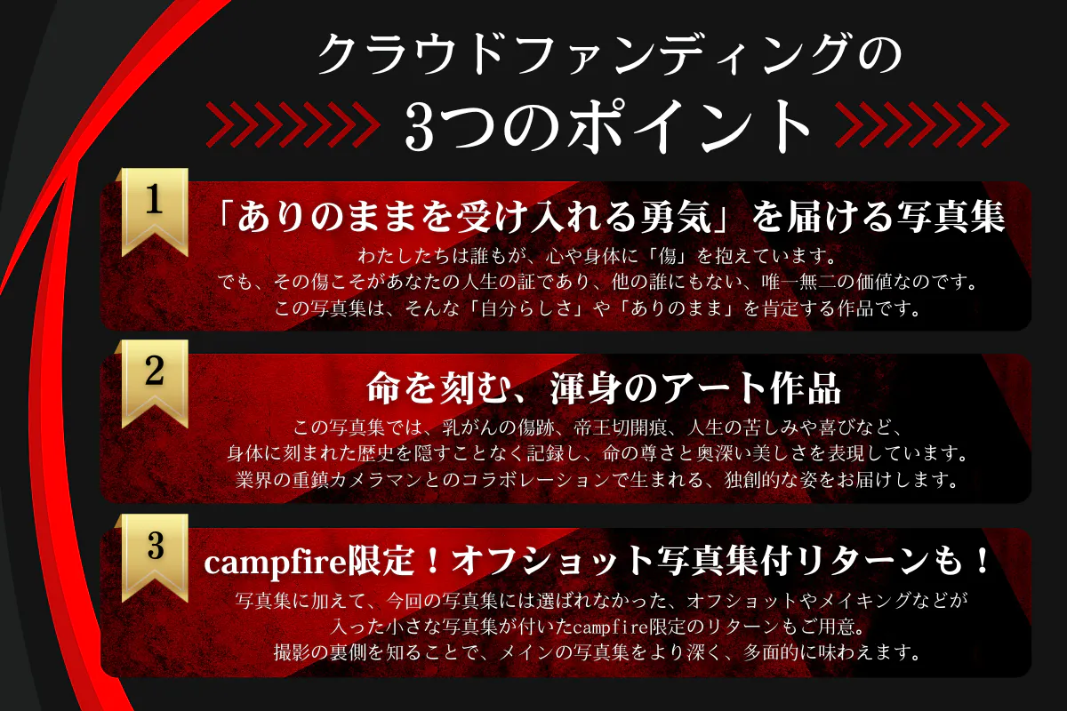このプロジェクトの目的は、写真集「SCAR」を通じて、「そのままの自分でいい」と思える勇気を届けることです。乳がんを経験した方はもちろん、告知されて絶望に押し潰されている方、自分に自信を持てない方、「わたしなんて」と思っている方、そして女性を支える立場にいる男性や家族の方々にも、このメッセージを届けたいと考えています。