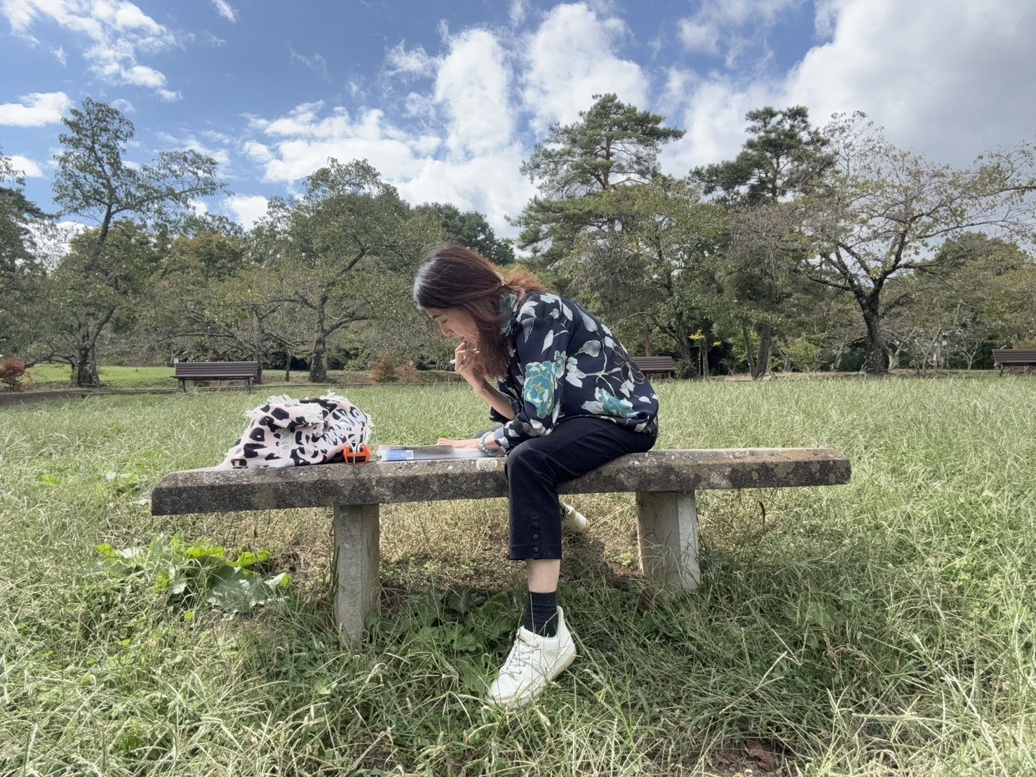カフェに行く前に、ベンチでPOPを書いて