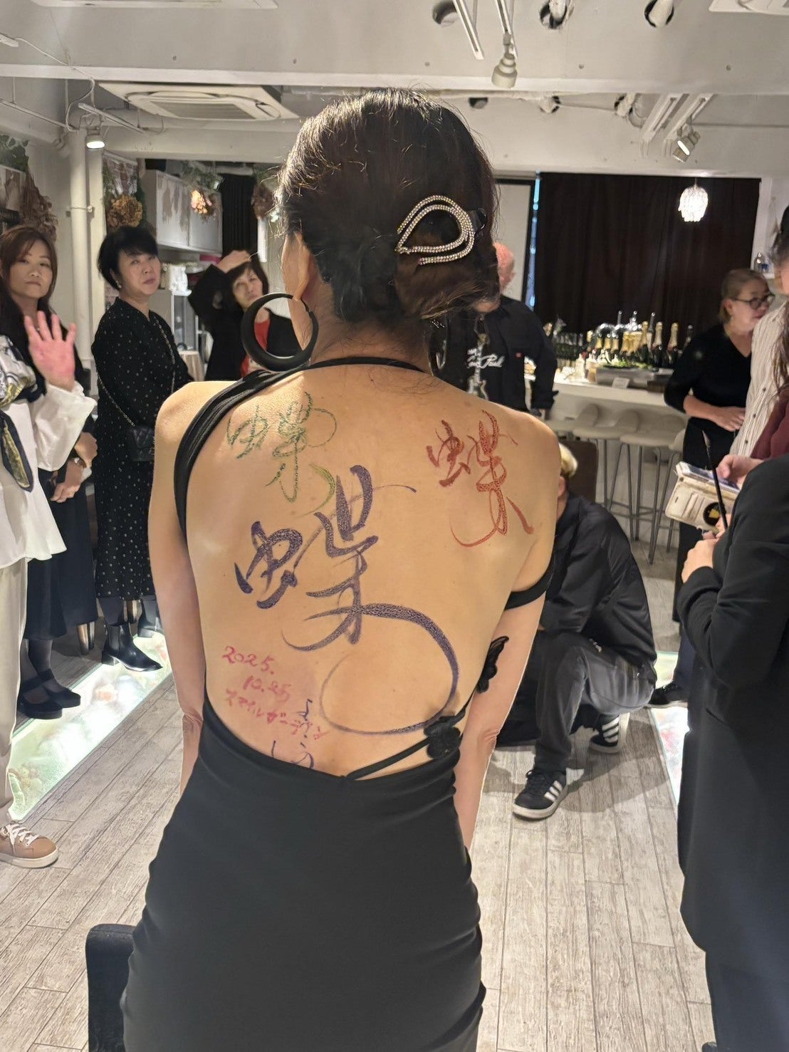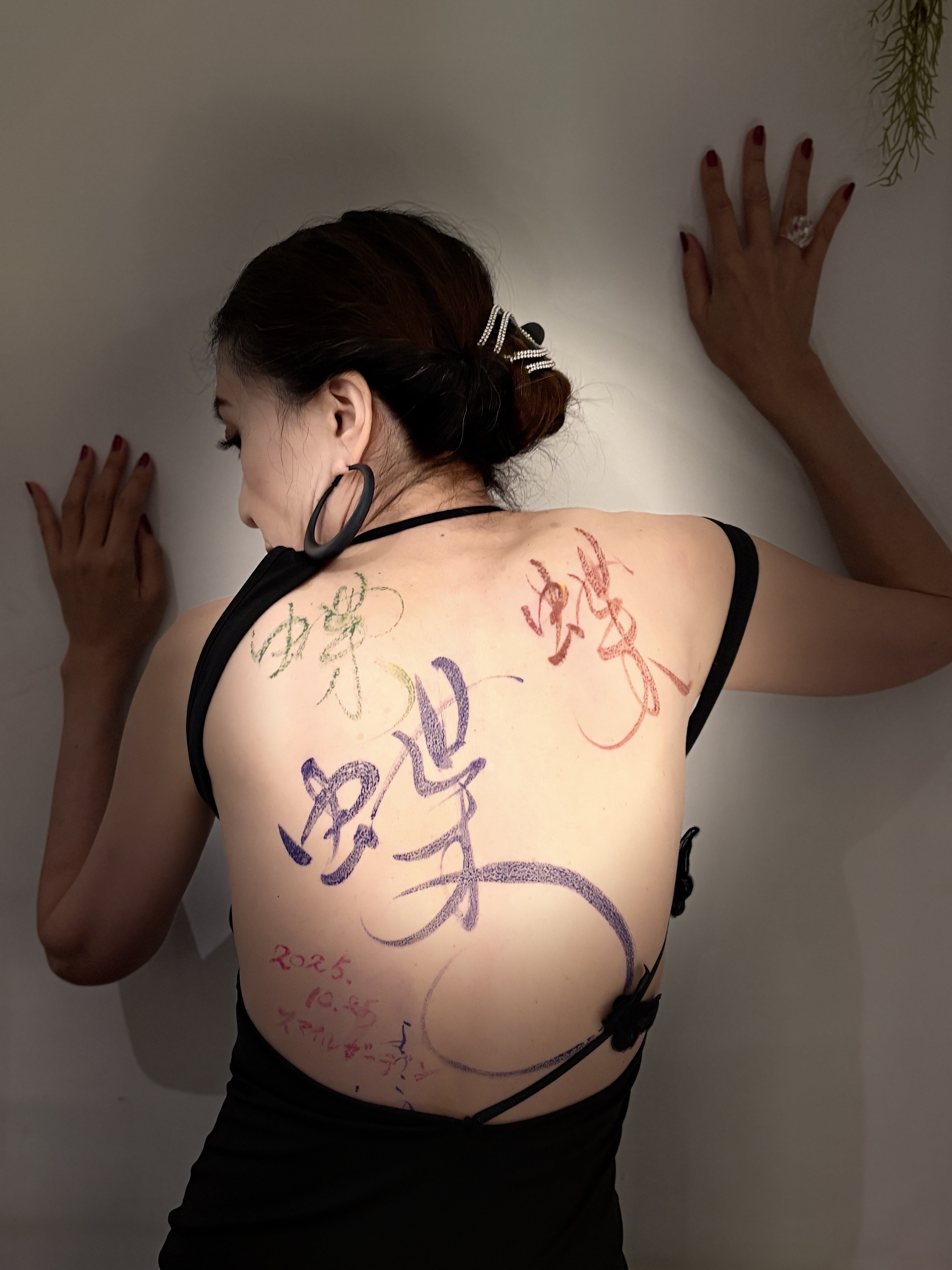 書家の野田しのぶ氏が、わたしの背中に「蝶」という文字を書きました。