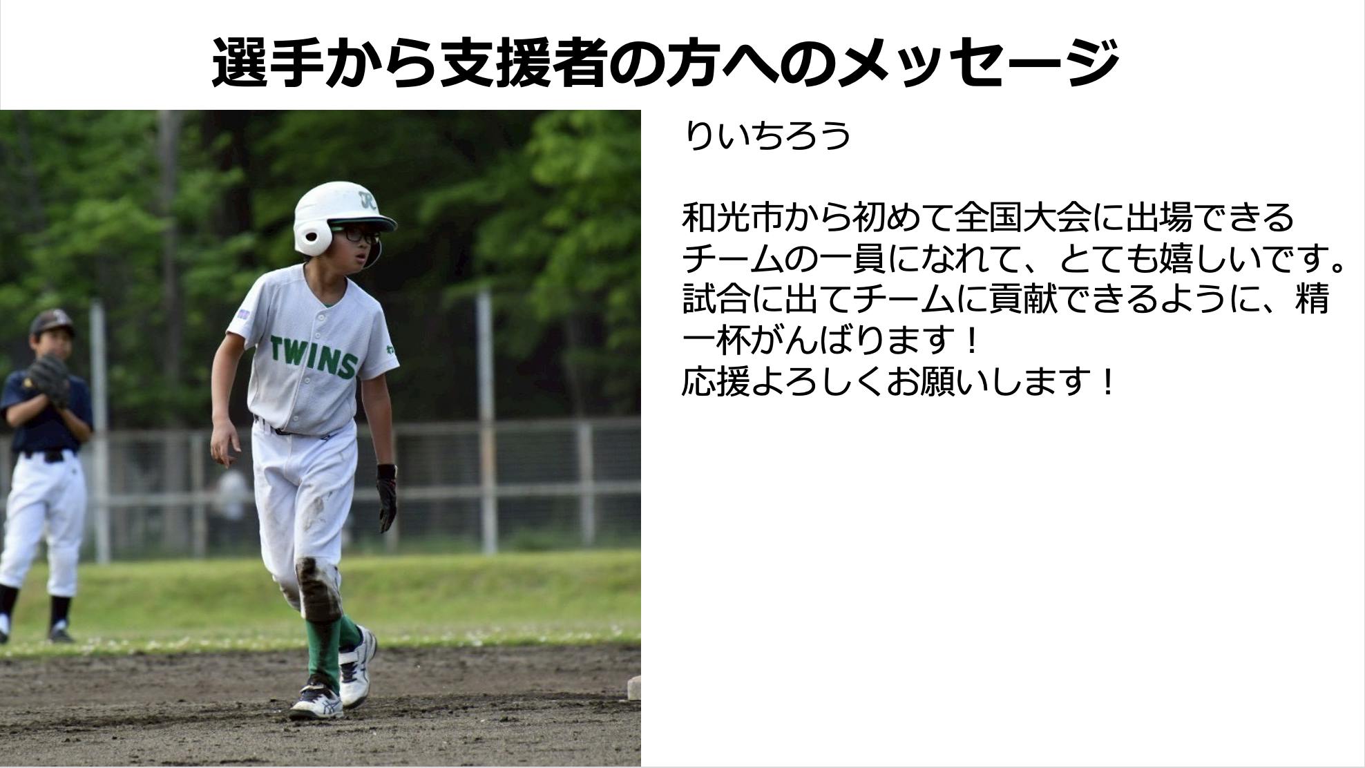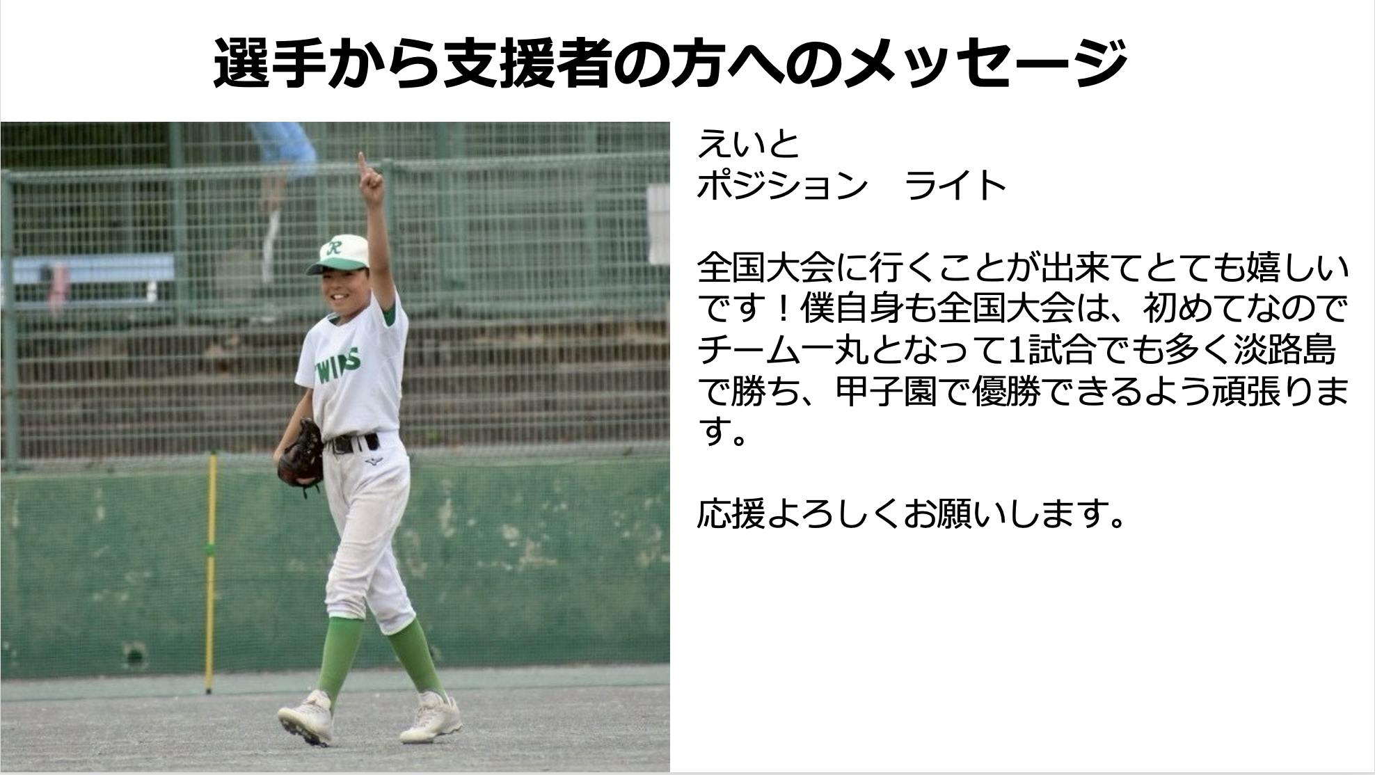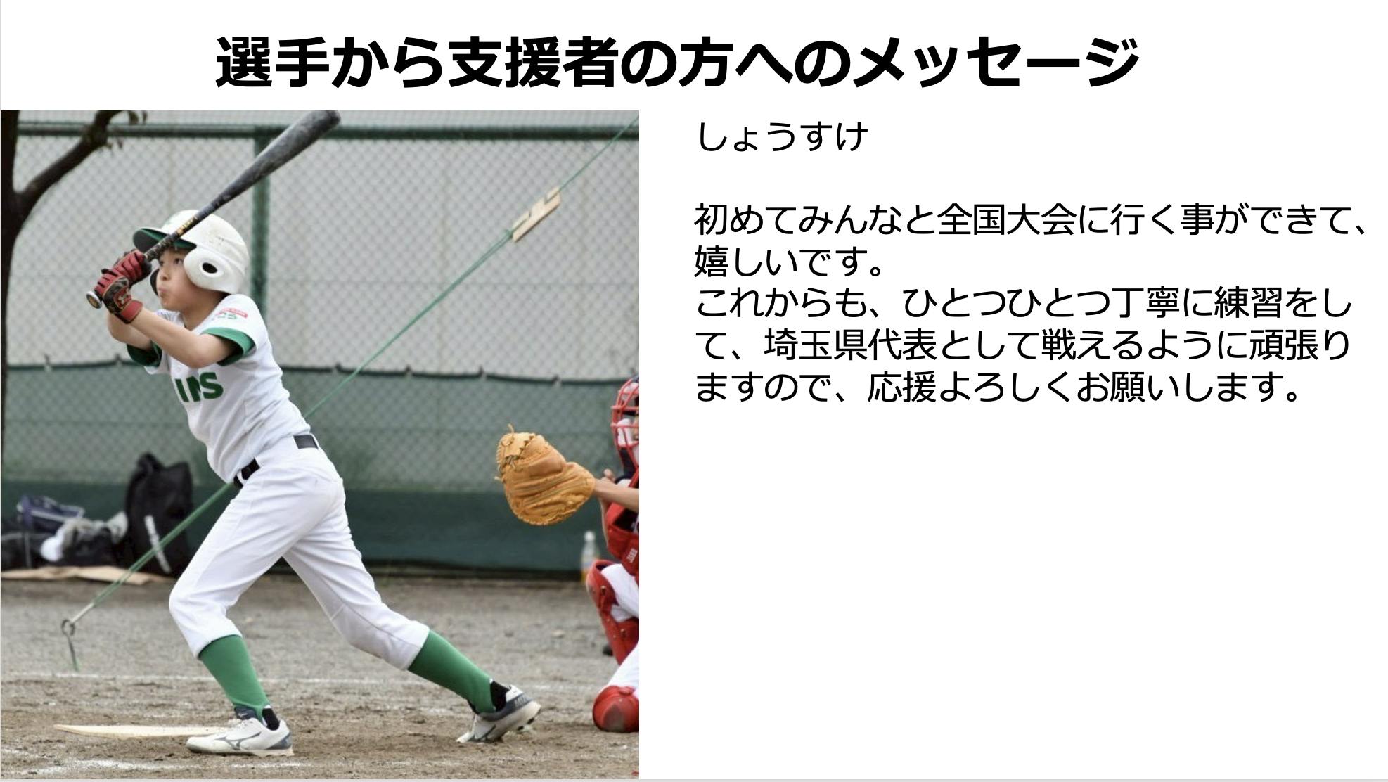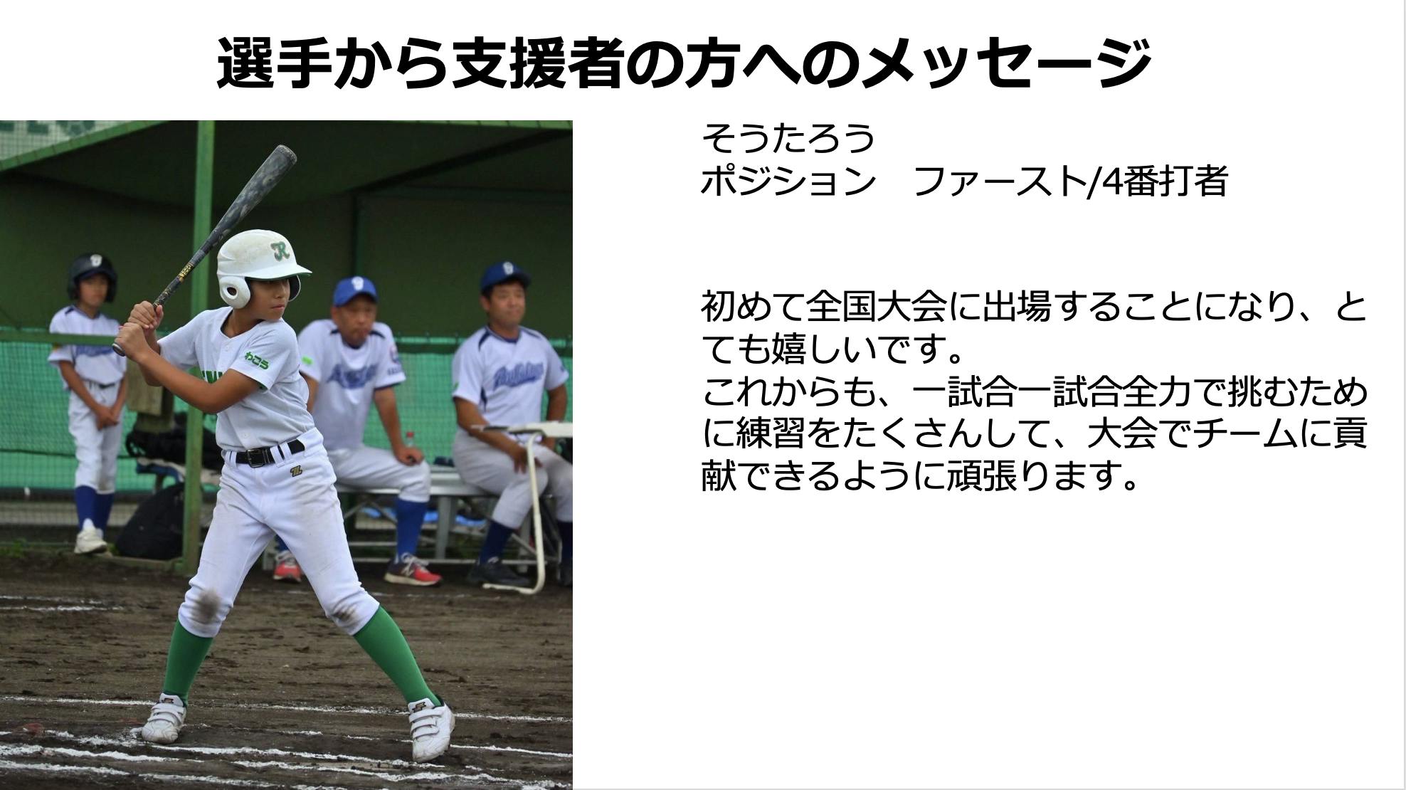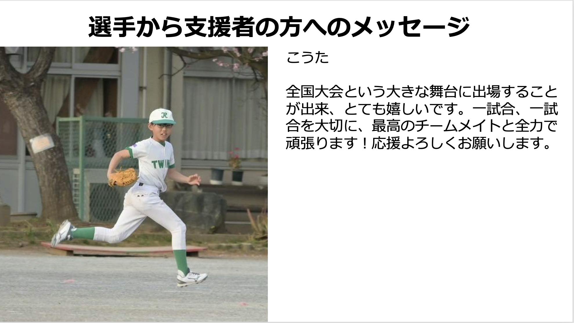 子供達にとって最高の思い出になると思います。ぜひその思い出作りと、子供達の成長を見守っていただく熱い思いでサポートいただけたら嬉しいです。選手スタッフ一同「ワンチーム」を大切にし、いただいた想いを胸に「選手ファースト」を貫いて全力で大会参加をサポートし、全国でも優勝目指して頑張ります。