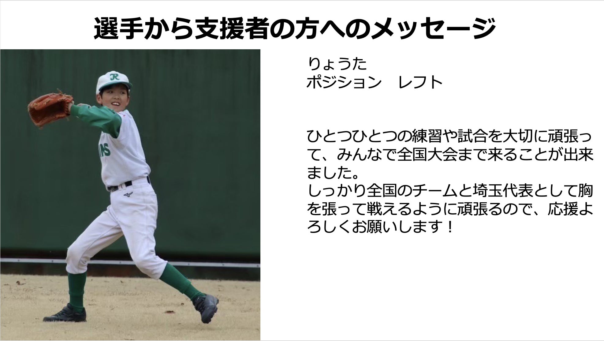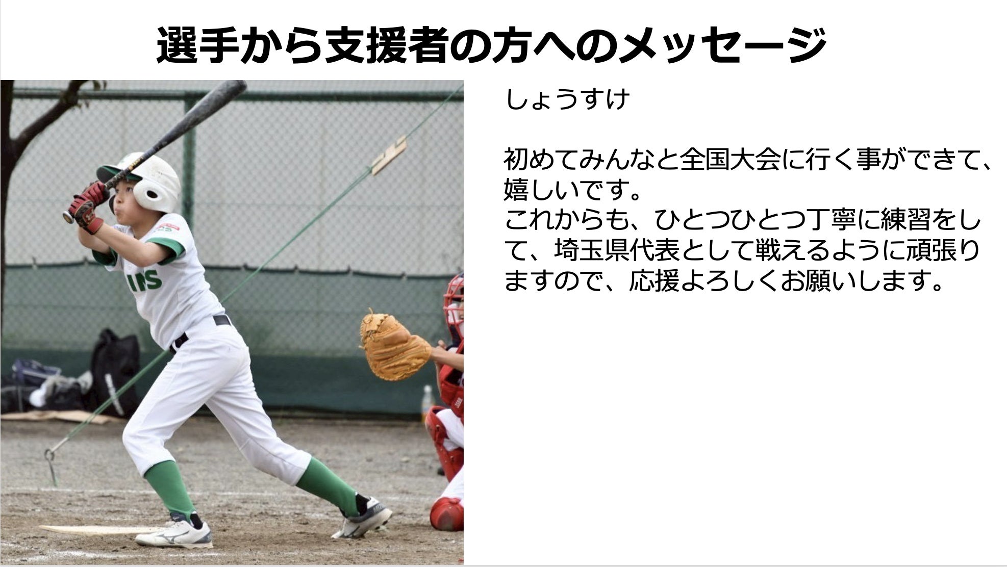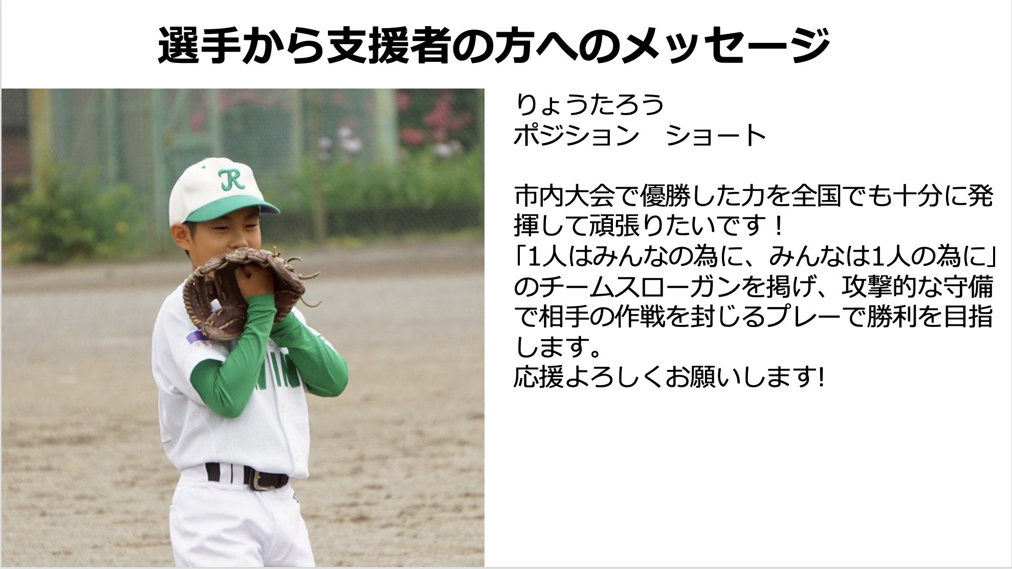 子供達にとって最高の思い出になると思います。ぜひその思い出作りと、子供達の成長を見守っていただく熱い思いでサポートいただけたら嬉しいです。選手スタッフ一同「ワンチーム」を大切にし、いただいた想いを胸に「選手ファースト」を貫いて全力で大会参加をサポートし、全国でも優勝目指して頑張ります。