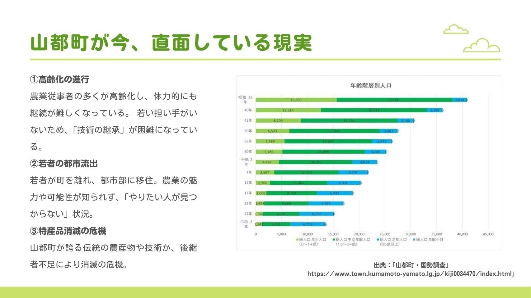 山都町では現在、高齢化と若者の都市流出により、農業の後継者不足が深刻な問題となっています。