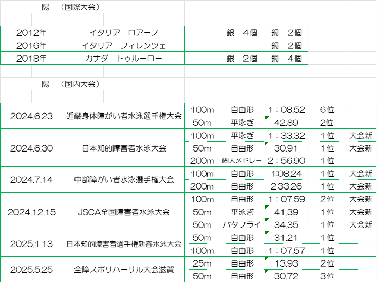 これまでに過去3度の国際大会を経験し、そのなかでも唯一獲れない金メダル。金メダルまで何が足りないのか…年齢的にも世界をあきらめかけていたそのとき、父親が親交のあるスポーツ医から「夢を簡単に諦めるな!」と元金メダリストのオリンピアンを高校3年生まで指導された奥谷直史コーチを紹介して頂きました。陽が29歳になろうかという2022年夏、チームでの練習と、奥谷コーチのパーソナルレッスンが始まりました。理解も動きもゆっくりな陽に対して根気よくご指導いただき、陽の持つ可能性を引き出してくれました。現在チーム練習と奥谷コーチのパーソナル練習を頑張っています。