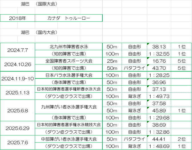 ダウン症かつ右手がない湖巴が泳げるようになるにはかなりの時間がかかりました。クロールの息継ぎでは体幹が保てず、息も吸えず、「できん!」と何度も泣きました。中学生になる頃、ダウン症選手権があることを知り、そこに出場したい一心でパーソナルコーチに指導を移し、湖巴が中学1年生の2018年夏、カナダで行われたダウン症水泳選手権に初出場。
