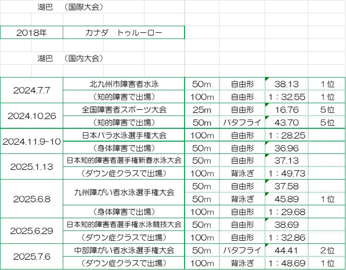 帰国後、すぐにチーム練習できる場所を探して、某スイミングスクールにて高校3年生まで健常者の生徒さん達と一緒に練習をさせて頂きました。高校卒業後、社会人になってからは水泳経験のない母と2人で自主練習の日々…そんな時に、プール内で湖巴の泳ぎをいつも見ていて、ふとアドバイスをくれる方に出会いました。それが現在所属している黒佐水泳学校の高木コーチです。