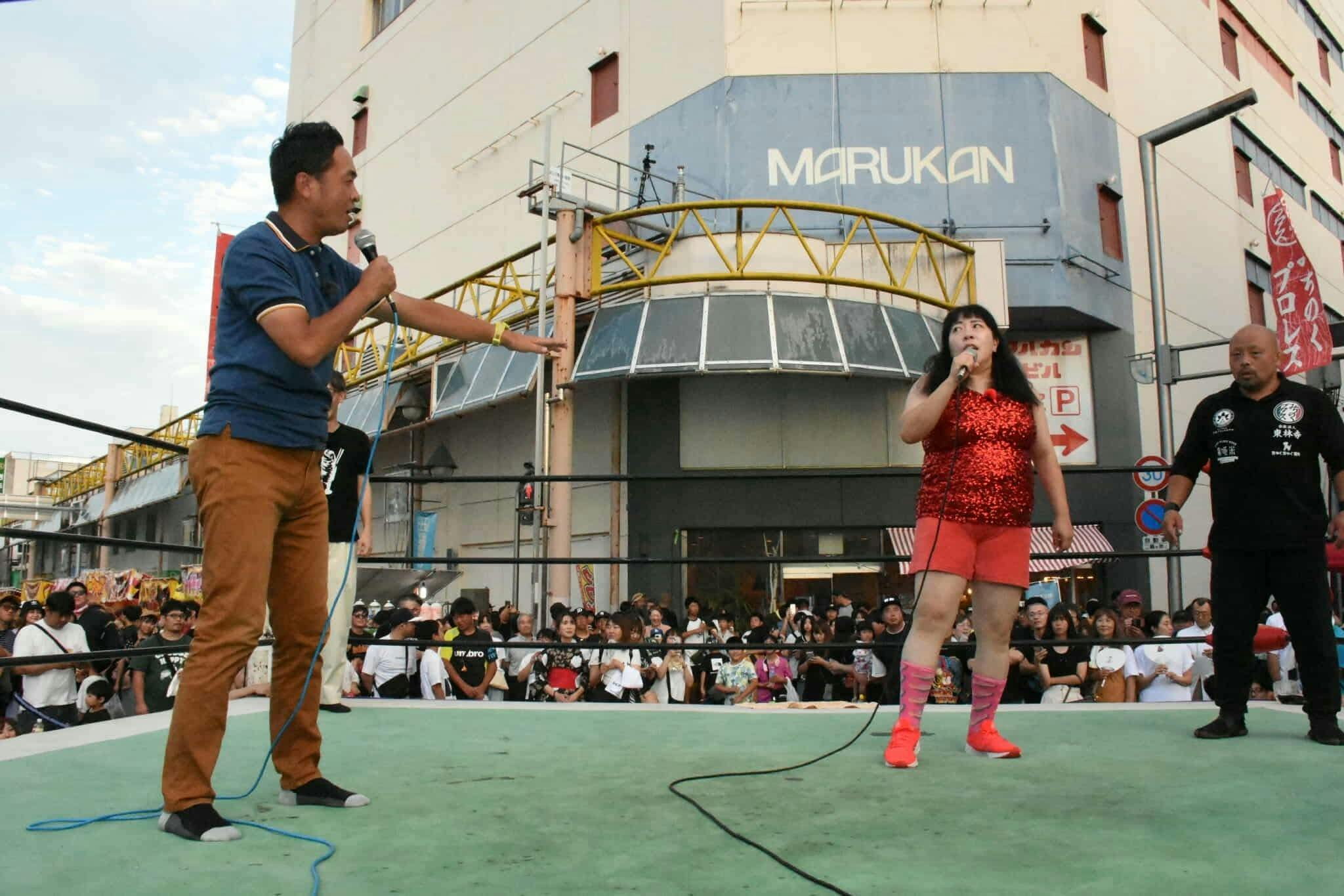 当日は、上町の商店街通りを通行止めにし、本物のプロレスリングを路上に設置。商店街が、まさにリングとなり、選手たちが迫力のある試合を繰り広げました。