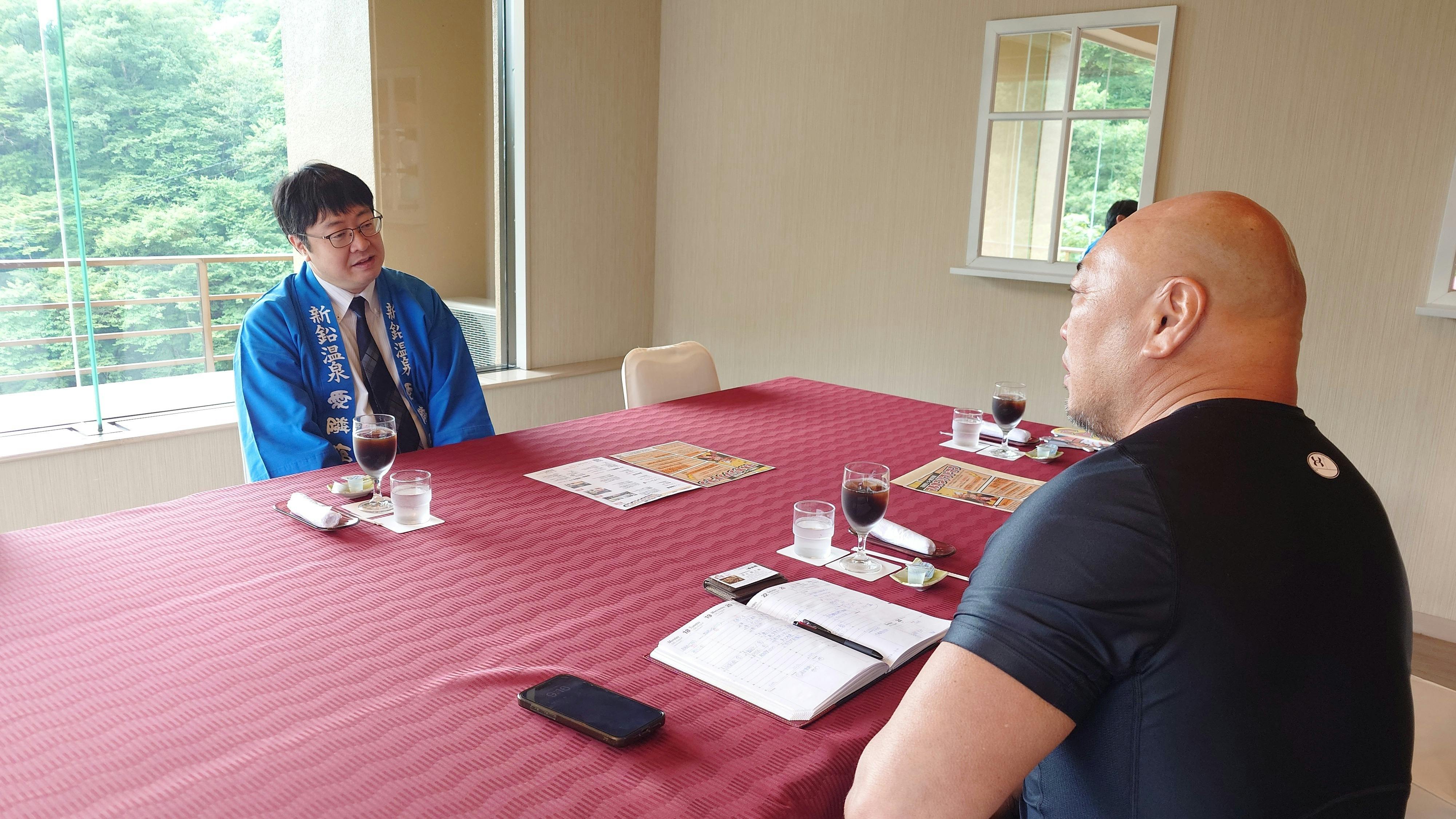 花巻市にて豊かな自然を活かし、17個の多様なお風呂、季節料理をビュッフェや懐石で楽しめる食事、そして温かいおもてなしを提供する「結びの宿 愛隣館」を運営する㈱新鉛温泉(以下、愛隣館)の代表 清水隆太郎様(以下、清水様)にみちのくプロレスの代表 新崎人生さん(以下、新崎)とマルカンビル大食堂を運営する㈱上町家守舎の代表 小友康広(以下、小友)がお伺いし、色々とお話を聞かせていただきました。ーーーーーーーーーーーーーーーーーーーー小友:今日はよろしくお願いいたします。早速ですが「マルカンソフトマン誕生」ということを知った時の第一印象は?清水様:新しい取り組みが地域に増えることはありがたい、嬉しい、と思いました。旅館業は地域に来ていただく必要があり、一企業でどれだけのことができるか以上に地域全体が魅力的になることが重要ですので、このような新しいヒーローが誕生することはありがたいことです。小友:愛隣館はウェルカムベビーの宿として有名ですが、子育て世帯や子ども向けに力をいれはじめたのはいつ頃でしたか?清水様:個人の方がインターネットを使って予約することが大分当たり前になってきた2008年頃に当時では先駆けとして「赤ちゃん大満足プラン」として、おむつ変え放題などのサービスの提供を開始しました。2012年にはミキハウス ウェルカムベビーの宿に認定いただきました。新崎:我々がマルカンソフトマンを誕生させる際にこだわりたかったのがまさに「子どもたちに喜んでもらう」ということでした。そのために10/13のマルカンソフトマンのデビュー戦は完全無料で子どもたちに見てもらいやすくしておりました。小友:愛隣館として旅行客ではなく「地域の子どもたち」に対して何か考えていることはありますか?清水様:花巻の温泉は誇れる地域資源と思っていますが市内からちょっと距離があるので、温泉に足繁く通ってもらえたらと思っています。実は年間通じてプロのマジシャンに来てもらって子どもたちに喜んでもらえる仕掛けも作っていました。ちなみに社員にもマジシャンがいますので、そのようなコンテンツを宿泊客以外にも地域の子どもたちにも何かできればと考えていました。小友:社員にも!それはすごいですし、子どもたちは喜びますね。清水様:マルカンビル大食堂は昔から花巻のまちなかの象徴ですし、子どもたちに喜んでもらえる場所になっていると思っています。そういった意味でもマルカンビル大食堂やマルカンソフトマンと何かコラボして地域の子どもたちに喜んでもらえることができたらと思っています。小友:それは是非ともお願いしたいです!今後とも応援よろしくお願いします!ーーーーーーーーーーーーーーーーーーーーわたしも何年か前に宿泊したことがありますが冬だったので雪景色がとても綺麗で、花巻の特産品がたっぷりの朝ごはんがとっても美味しかったのを覚えています。応援動画もいただきました!ありがとうございました!