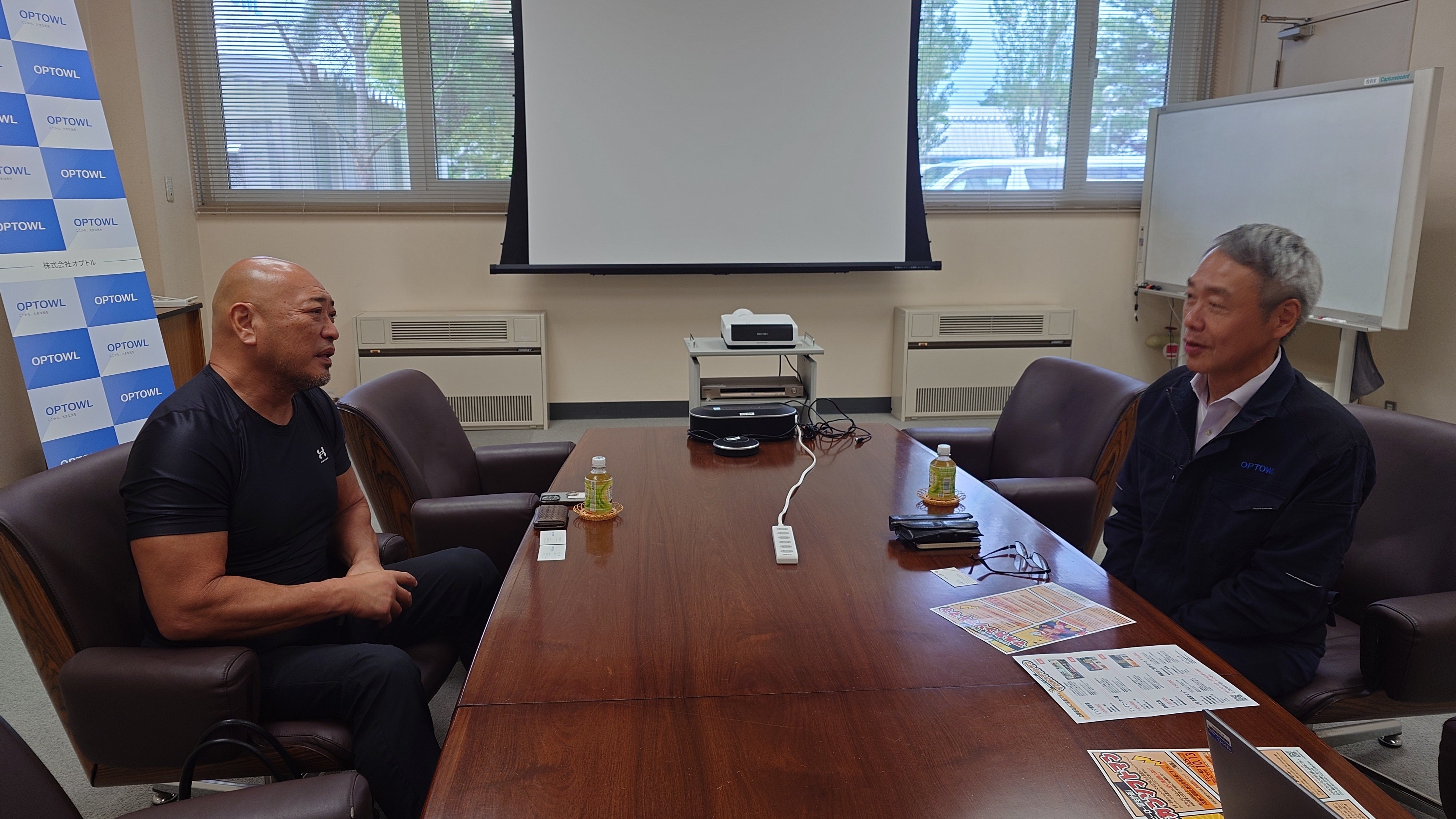 リコー光学が前身で、2024年に社名を改めた株式会社オプトル(以下、オプトル)は、光学製品で世界に挑戦するモノづくり企業です。企業理念に「光の恩恵を幸せにつながる価値へ」を掲げ、花巻の地に根差した技術とモノづくりで、人や社会、そして地球全体の幸せへとつながる価値を届けています。今回はその社長 竹本浩志様(以下、竹本様)にみちのくプロレスの代表 新崎人生さん(以下、新崎)とマルカンビル大食堂を運営する㈱上町家守舎の代表 小友康広(以下、小友)がお伺いし、色々とお話を聞かせていただきました。ーーーーーーーーーーーーーーーーーーーー小友:今日はよろしくお願いいたします。早速ですが「マルカンソフトマン誕生」ということを知った時の第一印象は?竹本様:すごく大胆なアイディア、発想もすごく良いと感じました。その理由はバーチャルのキャラクターではなくリアルであること。今日、新崎さんにお会いするだけでも「わ、すごい体」と驚きましたし、今スマートフォンなどバーチャルなものにいくらでもアクセスできる社会の中でリアルな体験、感覚というのは新鮮で喜ばれるものになると思っています。小友:確かにそうですね!7/21の上町宵宮(花巻の夏祭り)の時にみちのくプロレスさんにリング建てていただき、2試合やってもらったのですが、まさに竹本様が仰ったことの通りのことがその場で起きていたことを実感しています。竹本様:今回のプロジェクトの良いのは、ただプロレスを見るだけでも楽しいはずなのに、そこに地元のヒーローがいて、更にそれがマルカンソフトマンという花巻の大切なものがベースというのは更に楽しいですよね!私は出身が愛媛県なのですが、小学校の時に地元にジャイアント馬場さんがいらして野外で試合やっているところを見て本当に興奮、感動したのが今でも鮮明に記憶に残っています。花巻の子どもたちも、私と同じようにマルカンソフトマンの試合が楽しかった思い出として記憶に残ってくれると思いますよ!新崎様:みちのくプロレスは子どもたちが見に来る機会がどんどん減ってきていた中で、今回の取り組みをきっかけに地域のまつりや商業施設での興業依頼も増えてきており、そこでマルカンソフトマンが試合することで子どもファンが増えると思ってます。竹本様:他の地域でも同じように自分たちの身近なヒーローが誕生することで地域ごとに応援するマスクマンが違っていたりする未来とか、色々な展開が実現できそうですよね。新崎:仰るとおり、そのような展開に発展させられたらと思っています。竹本様:我々にもご支援できることがあると思うので、今後とも交流をお願いします。小友:ありがとうございます!今後ともよろしくお願いいたします!ーーーーーーーーーーーーーーーーーーーー※㈱オプトル様からはクラウドファンディングのご支援もいただきました! 応援ありがとうございます!!