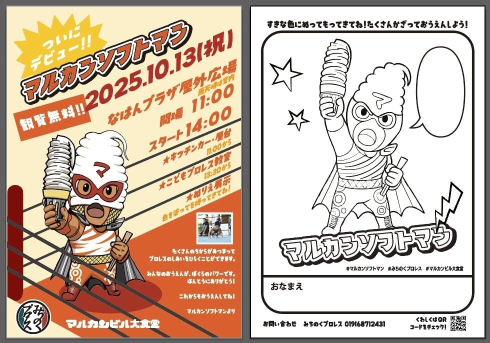 花巻のランドマークとなっているマルカンビル大食堂の人気メニュー10段もある「ソフトクリーム」と岩手を代表するプロレス「みちのくプロレス」のコラボ企画!新レスラー「マルカンソフトマン」を誕生させ、10月13日に沢山の子どもたちを招待したデビュー戦を入場無料で開催したい!