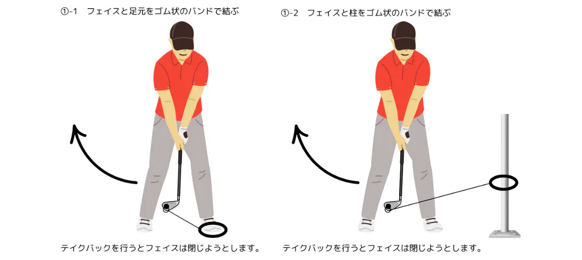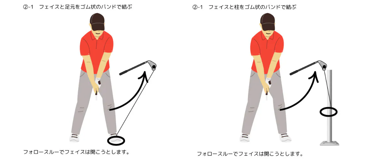バンドを左足で踏んで固定しながら素振りをすることでトレーニングをしながらフェースローテーションの意識をすることができます!