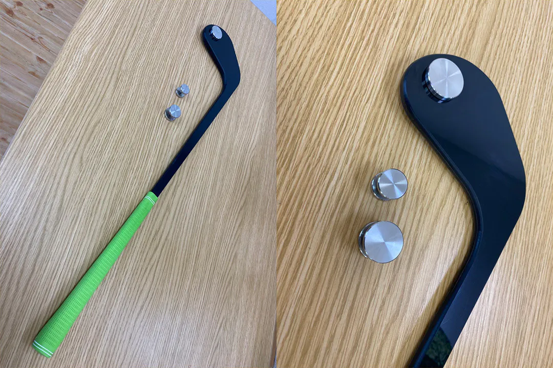 短いアイアン状のクラブのトウからバンドが伸びた特殊形状。