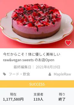 2025/08/19 11:37「優しさスウィーツ」とは、身体にも心にもやさしく食べる人も作る人も笑顔になれるそんなsweetsです。「優しさスウィーツプロジェクト」とはそのやさしさをもっと沢山の方へ届ける活動です。疲れていたある日の帰り道幸せになるsweetsを自分へのご褒美に買おう!と思ったら〜すごくワクワクして疲れが吹き飛びました。近くのデパ地下でご褒美になるヴィーガンでグルテンフリーなときめくような見た目も可愛いらしいそんなsweetsを求めて1時間くらい探し回りました・・・でも、どんなに探しても欲しいスウィーツは見つからなくて・・・どんどん悲しい気持ちになりました。さっきまであんなにウキっとしたのにまた嘘のようにしょんぼりな気持ちになってしまいました・・・その時気付いたんです!私がこんなに悲しい気持ちになるのなら、私のように〜いや、もしかしたら私以上に悲しい思いをしている人達が居るんだ!!と小さな出来事かもしれませんがあの日疲れていた私がご褒美にスウィーツを買おう!と思った瞬間一気に疲れが吹き飛びとても幸せになり、、、一転どれだけ探しても簡単には手に入らない現実に落胆し・・・その波のような感情のおかげで全てがつながりました!もっと力をつけよう!そして、あそこに行けば買える!を増やしていこう!!これは私が出来る、Maple Rawだからできるこの先の人生を賭けたい本気のチャレンジになりました。今はまだ微力ですがこれまでも本気で実現したい!とスイッチが入った事は試行錯誤、山や谷など色々あっても具現化してきました。優しさスウィーツブロジェクト最初のチャレンジがビジネスコンテストと連動しているCAMPFIREです。ビジネスコンテストは二次審査で敗退しましたが、挑戦はは叶うまでいろんな方法で続けていきます!少しでも賛同していただけたらご縁のある誰かに繋がる為にもシェアして貰えたら嬉しいです。あと残り1日なので今回は頑張りすぎずに伝わるかを実験!なんて思っていたら全く伝わらず^^;自業自得なのですが、最後に出来ることを今更ながらやってみようと綴ってみました。是非!よろしくお願いしますm(_ _)m もっと見る