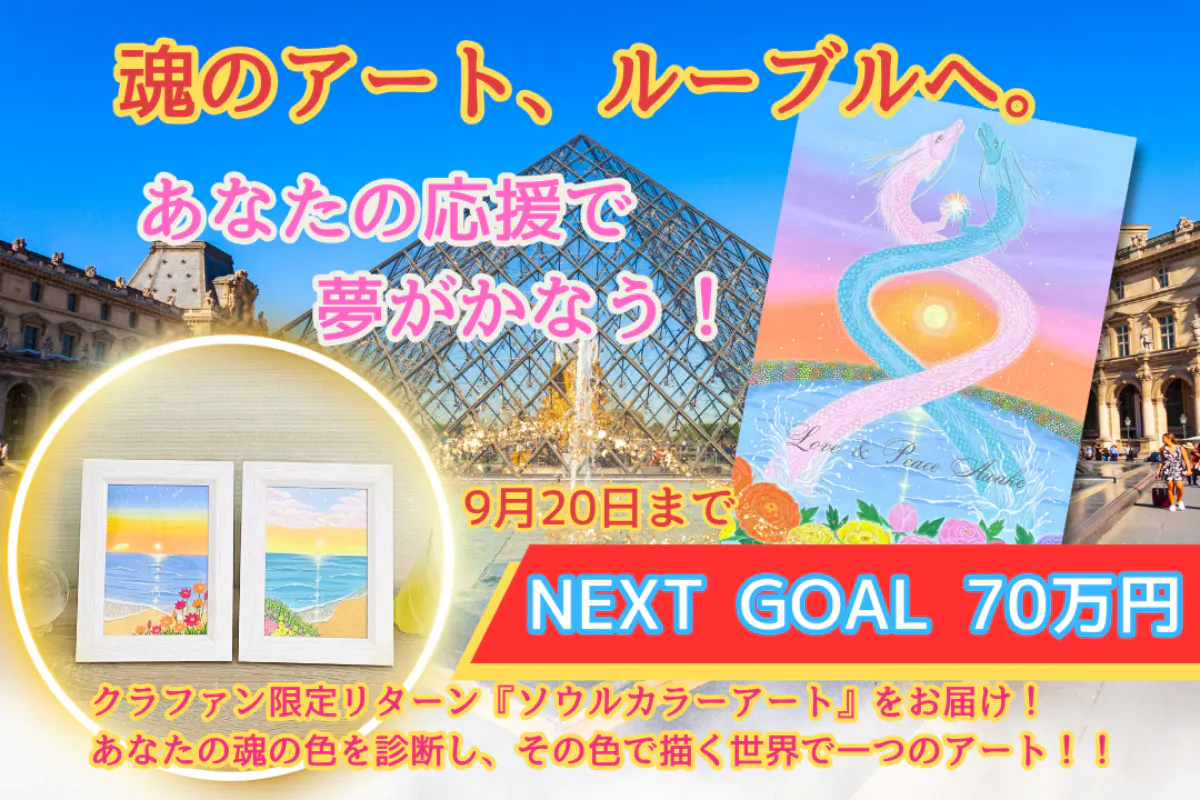 2025/08/16 23:12みなさま、たくさんのご支援を本当にありがとうございます。クラウドファンディングもいよいよ残り36日。現在 目標55万円のうち約40万円 が集まりました。本当にここまで支えていただけたことに、心から感謝しています。ですが…あと 15万円。ここを乗り越えないと、ルーヴル美術館への展示という大きな挑戦が叶いません。8月の頭にBJ福岡のコンテストを終え、やっと落ち着いてきたので、今は毎日、返礼品である ソウルカラーアート を描いています。魂の色を描く時間は、私にとっても祈りのような大切な瞬間です。一枚一枚に願いを込めて仕上げています。 もしご支援を迷っている方がいらっしゃったら、ぜひこの機会にお力を貸してください。私の作品「愛と平和の目覚め」をルーヴル美術館に届けるために、どうか最後の一押しをお願いいたします。一緒にこの夢を叶えていただけたら、とても心強いです! もっと見る