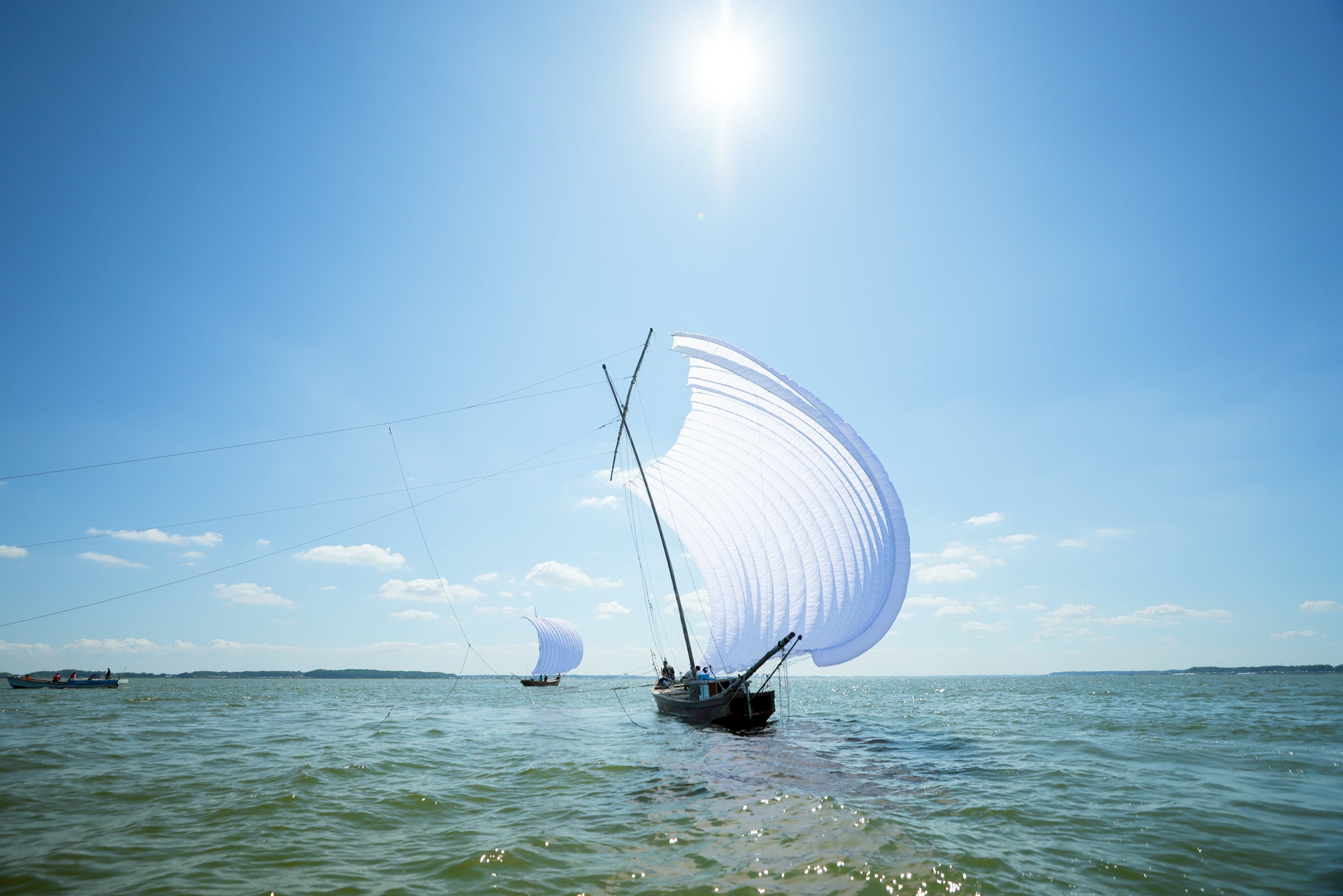 白い帆が風を受け、湖の上をゆったりと進むその姿は、まさに霞ヶ浦の夏の風物詩。
