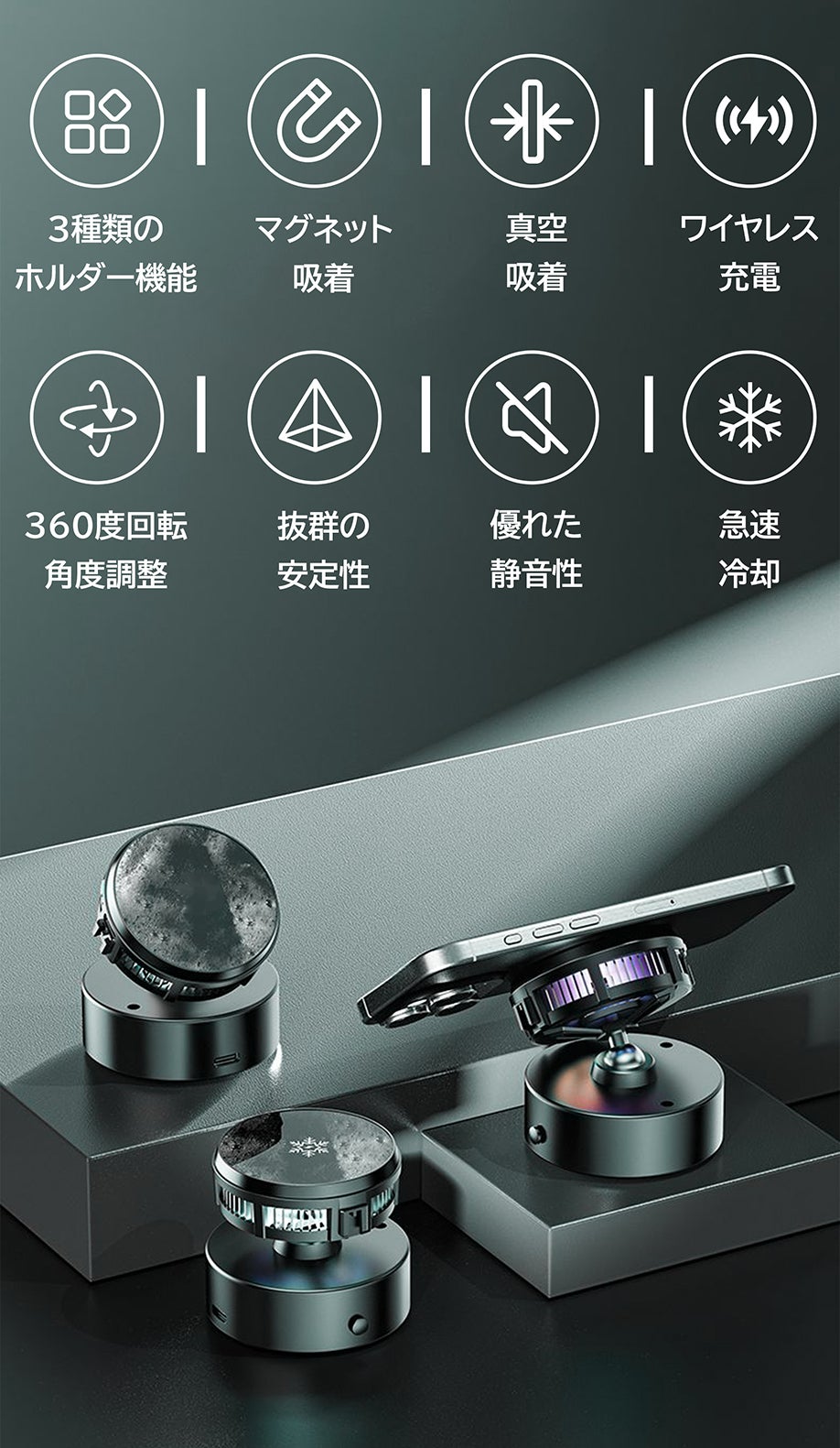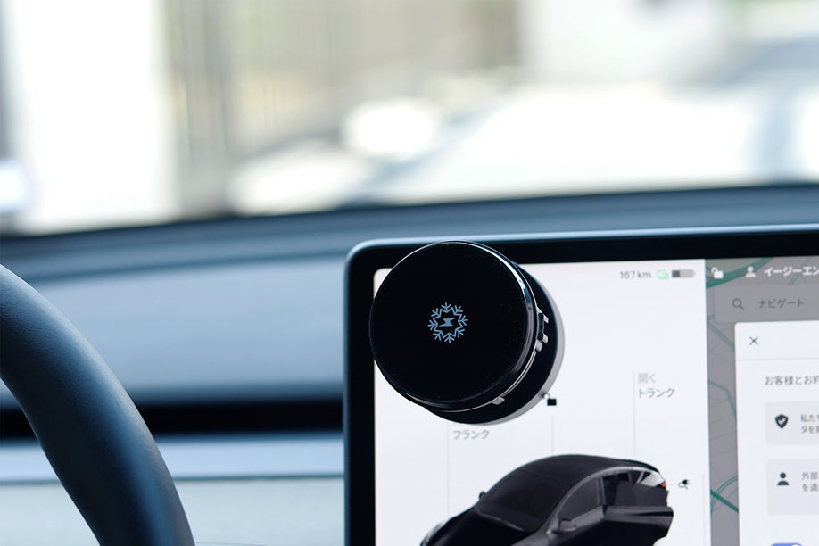 磁気式と真空式を同時に搭載し、どんな平らな場所でもスマートに設置できます。さらにQi充電対応で最大15Wのワイヤレス充電機能と、ナビ中や充電中の熱を抑える冷却システムが備わる革命的なホルダー「Pylo」(パイロ)。