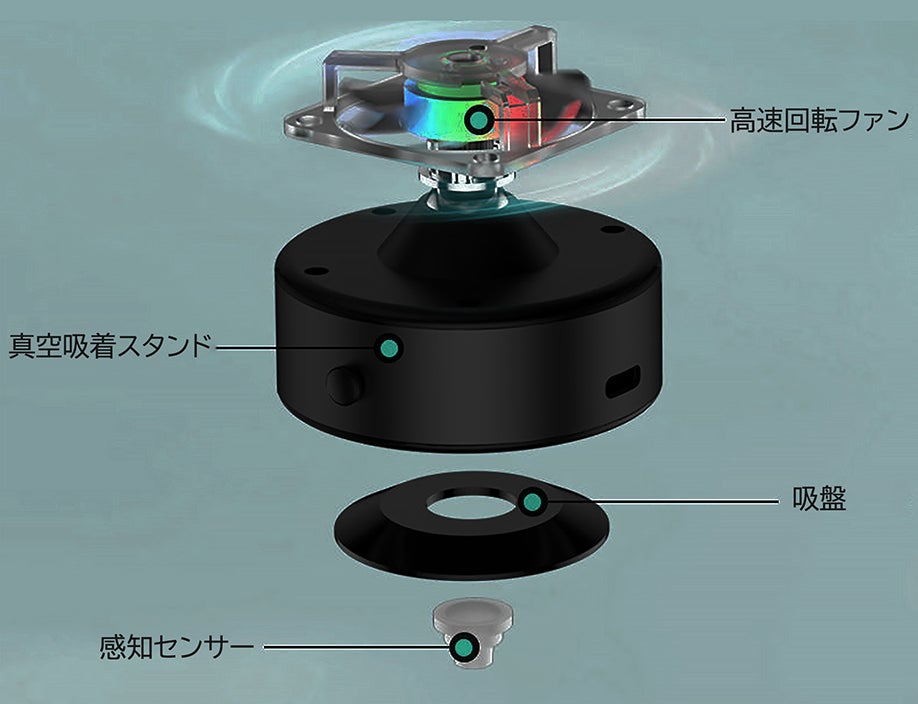 吸盤に空気圧センサーが内蔵され、平滑な面に置くだけで瞬時に空気を排出して自動吸着します。