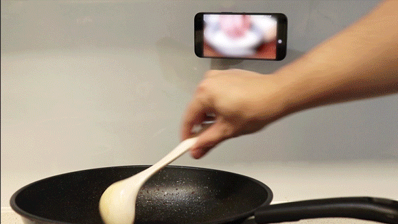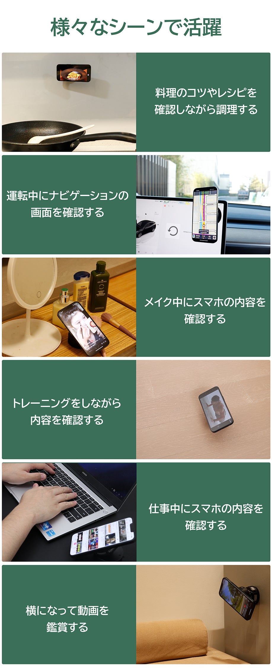 角度調節も簡単なので見やすい位置に設置し、スマホの内容を確認しながら運転や、仕事、料理、メイクに集中して楽しむ事ができます。