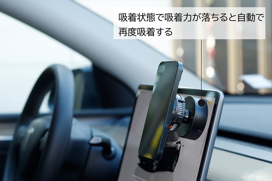 粘着式のホルダーとは違い、「Pylo」は接触面に跡が残らない磁気式と真空式を組み合わせた構造を採用します。