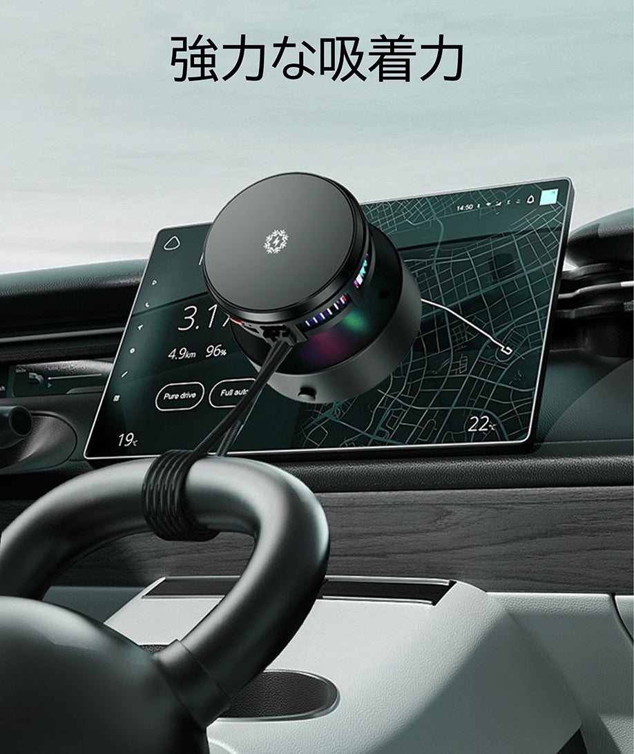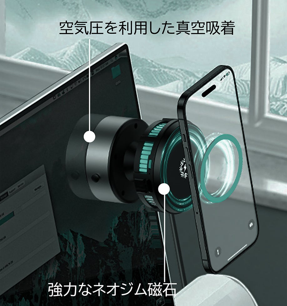 -65kPaの空気圧とN52グレードの強力なマグネットが相まって、抜群の吸着力を実現し、強く振っても外れません。