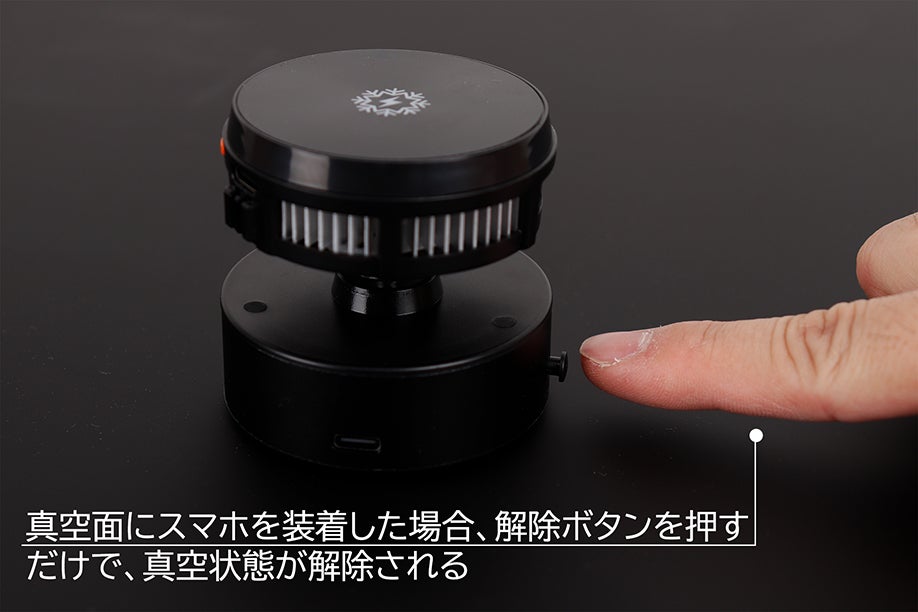 A2:真空解除ボタンを押さずには取り外すことができません。一方、本体の反対側のマグネット部分は力を加えることで外すことができます。真空側を無理に取り外そうとすると、製品が損傷する可能性がございますので、ご注意ください。