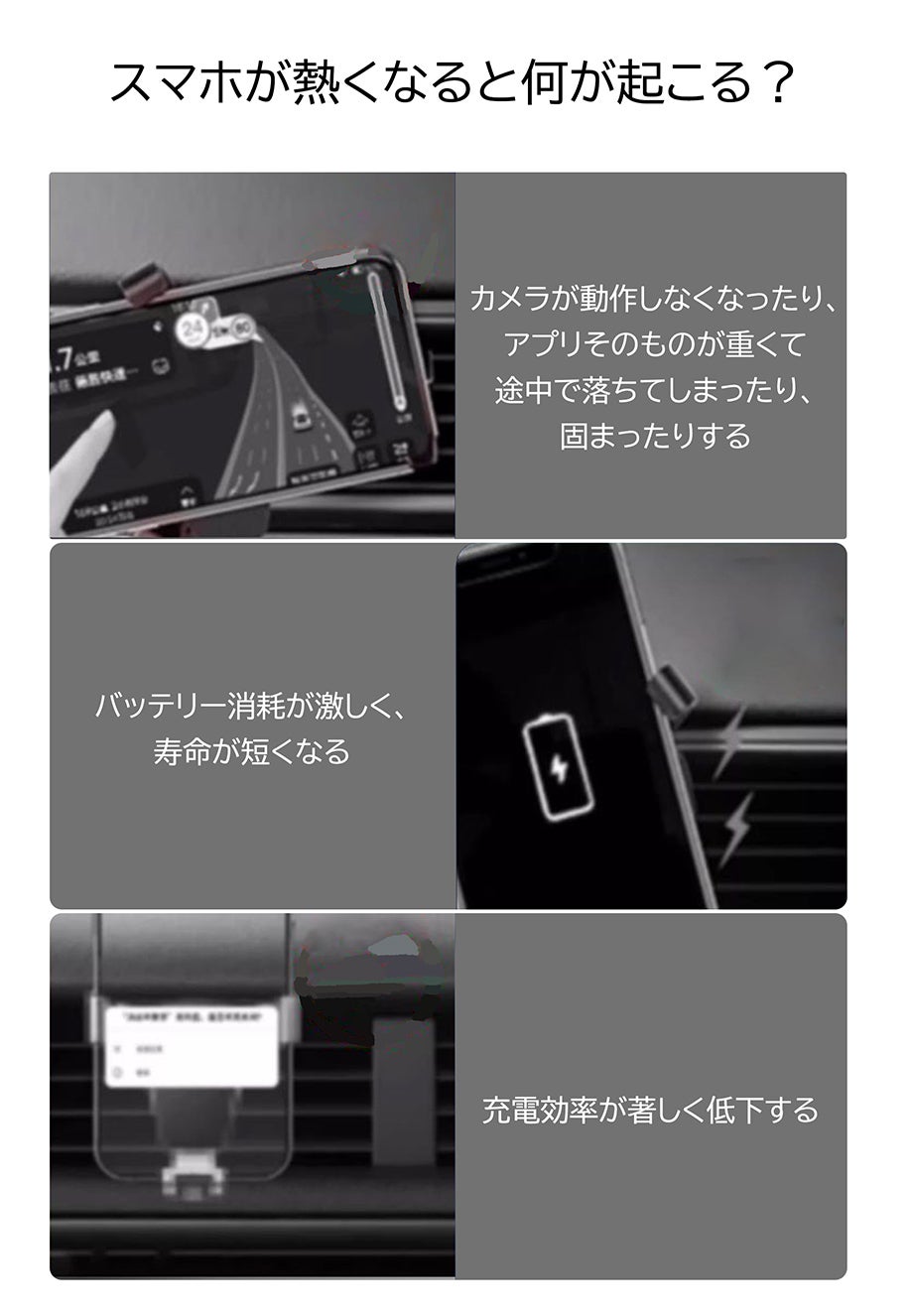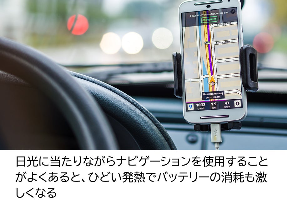 ナビゲーションやワイヤレス充電する際に回避できないのはスマホが熱くなることです。そして、スマホが熱くなると、バッテリー消耗や寿命とそれに伴う性能の低下などが発生します。