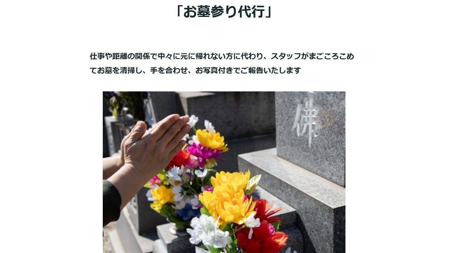 仕事や距離の関係で中々に元に帰れない方に代わり、スタッフがまごころこめてお墓を清掃し、手を合わせ、お写真付きでご報告いたします