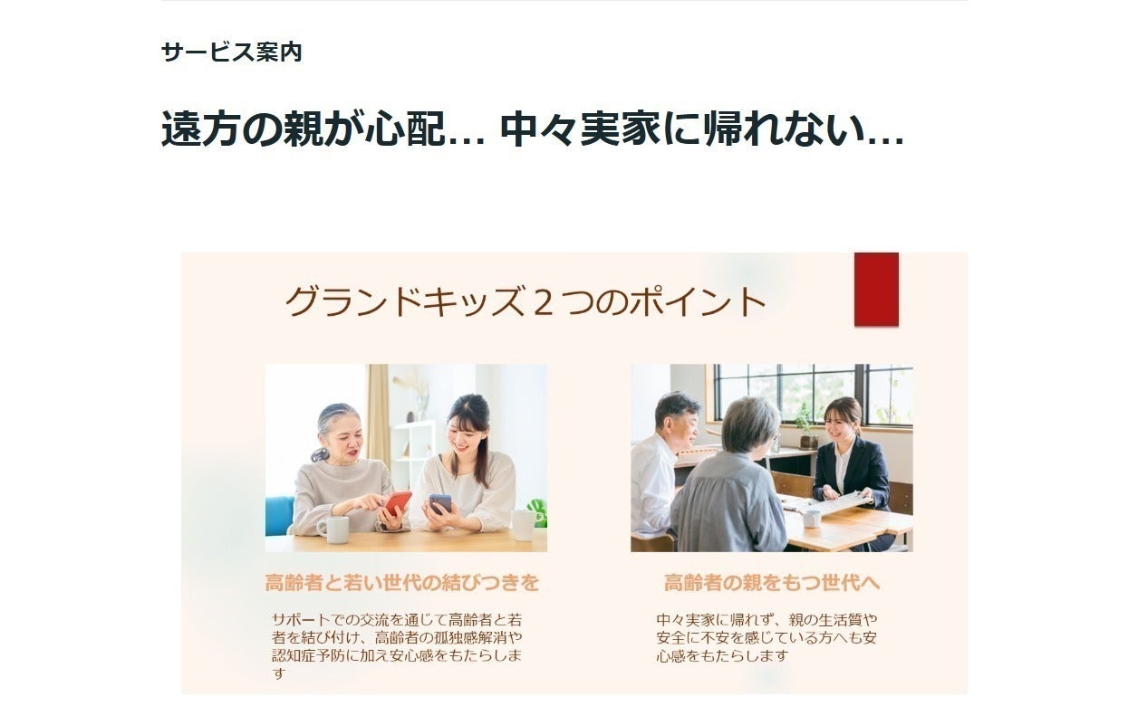 しかし高齢者から学べることや得られる価値観、経験は計り知れません。この孫レンタルサービス「グランドキッズ」を通じて、若年層が高齢者と交流し、彼らの知恵や経験を学び取ることで、人生観や価値観が深まることを目指しています。若い人々が高齢者とのつながりを持つことは、自分自身の成長にもつながり、結果として社会全体のつながりや思いやりの文化を育む一助となると確信しています。そして最も重要なのは、社会全体でこの支援体制を築き上げ、未来の高齢者世代にとって、また彼らを支える若年世代にとっても「安心して頼れる社会」の土台を作ることです。このプロジェクトはただのサービス提供にとどまらず、「支え合う社会の形成」を目指しており、少子高齢化が進む日本における新たなコミュニティの形を示すものだと考えています。