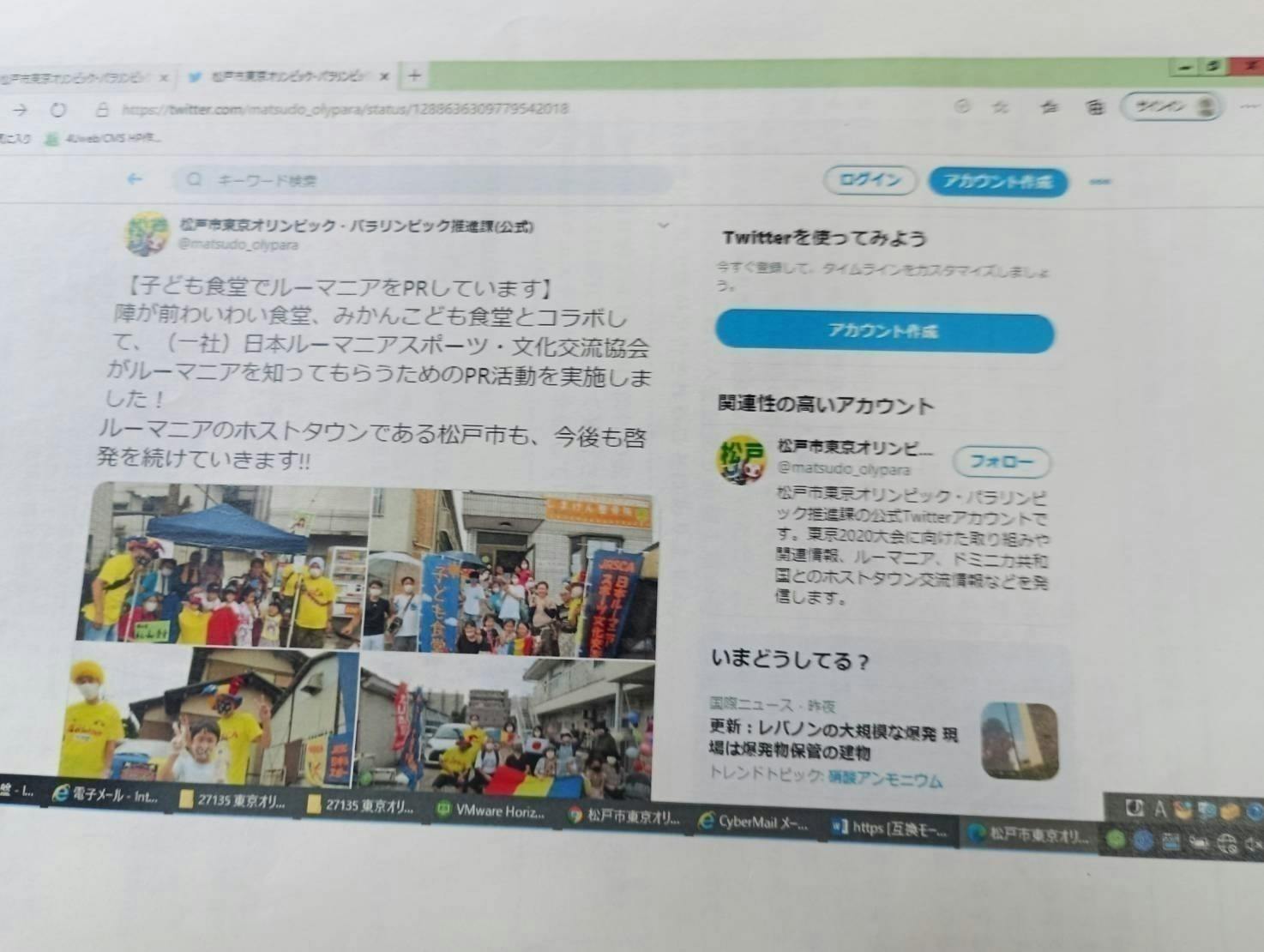 (27) 5月より月に一度のペースで9月まで松戸市内の子ども食堂様に参加させて頂き、ホストタウンをアピール。特に9月22日はルーマニアのクラウディア・ボボーチャ選手とインターネットを通して交流を図ることが出来たことは、コロナ下にあって、大きな収穫となった。また、ボボーチャ選手から松戸市にメッセージ動画が届いた(令和2年5月~9月)