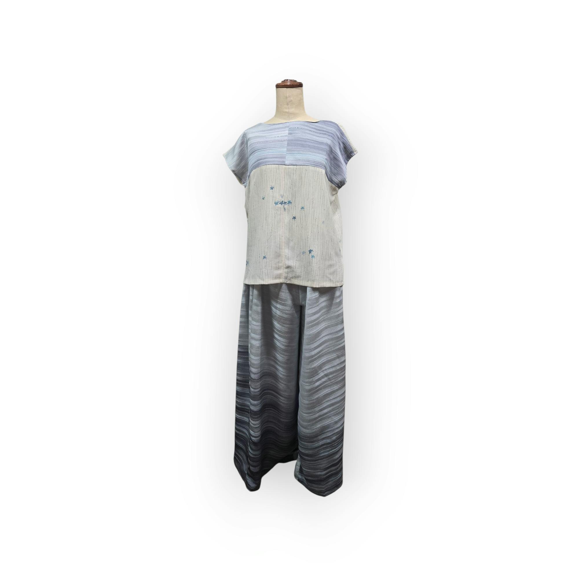 たっぷりと贅沢に布を使い、着物幅を生かした美しいギャザーが特徴。ウエストはゴム仕様で、着心地も快適。日常からお出かけまで幅広く活躍します。