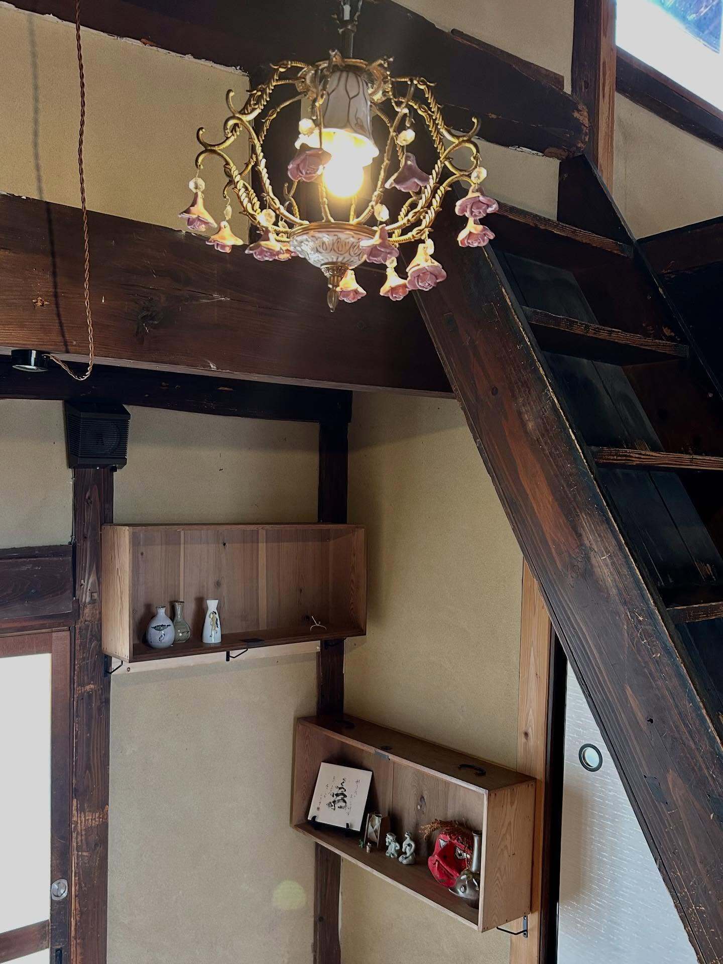 シェアオフィスの玄関に可愛いシャンデリアと棚を設置しました。この棚は古い箪笥の引き出しを使用したものです。